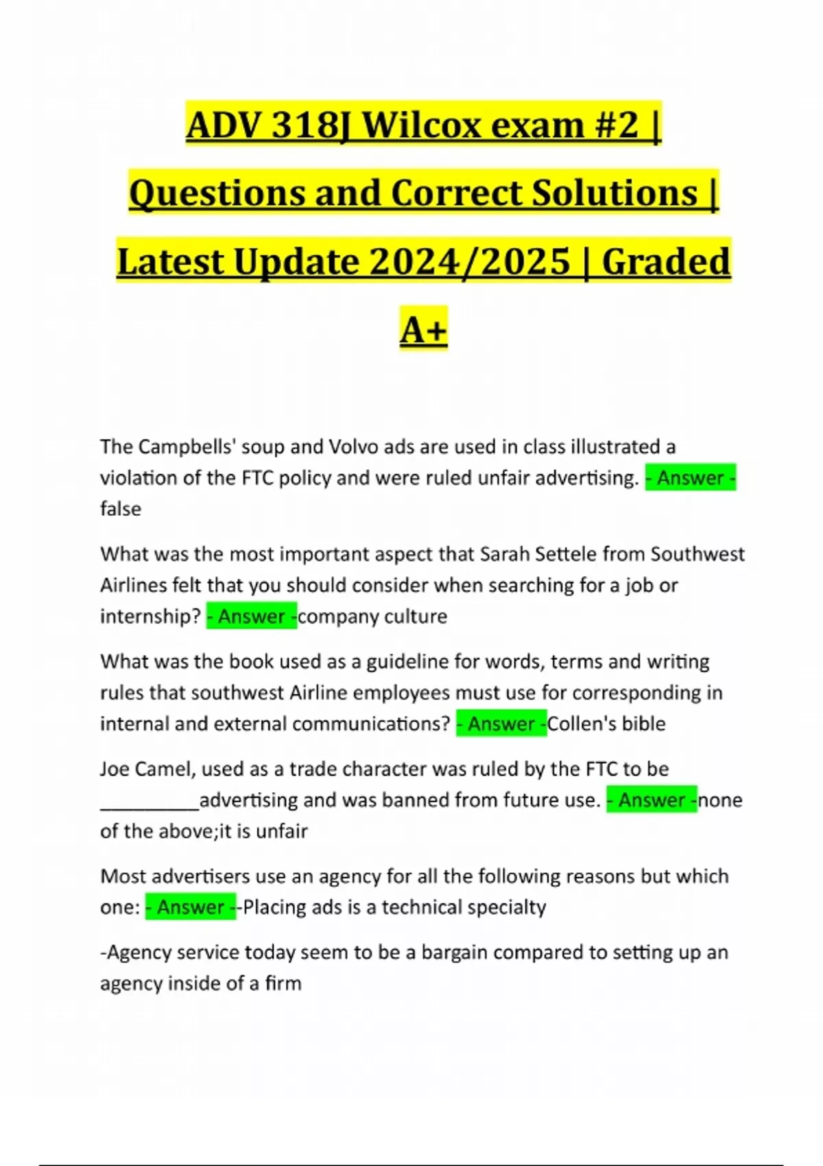 ADV 318J Wilcox exam #2 | Questions and Correct Solutions | Latest Update 2024/2025 | Graded A+ The Campbells' soup and Volvo ads are used in class illustrated a violation of the FTC policy and were ruled unfair advertising. - Answer - false What was the most important aspect that Sarah Settele from Southwest Airlines felt that you should consider when searching for a job or internship? - Answer -company culture What was the book used as a guideline for words, terms and writing rules that southwest Airline employees must use for corresponding in internal and external communications? - Answer -Collen's bible Joe Camel, used as a trade character was ruled by the FTC to be _________advertising and was banned from future use. - Answer -none of the above;it is unfair Most advertisers use an agency for all the following reasons but which one: - Answer --Placing ads is a technical specialty -Agency service today seem to be a bargain compared to setting up an agency inside of a firm-Most marketers don't want to get into the agency business -Creating ads is a sensitive craft All of the above are reasons advertisers use ad agencies Which of the following is NOT a popular buying motive illustrated in class - Answer -dependence In making an attitude connection, using t