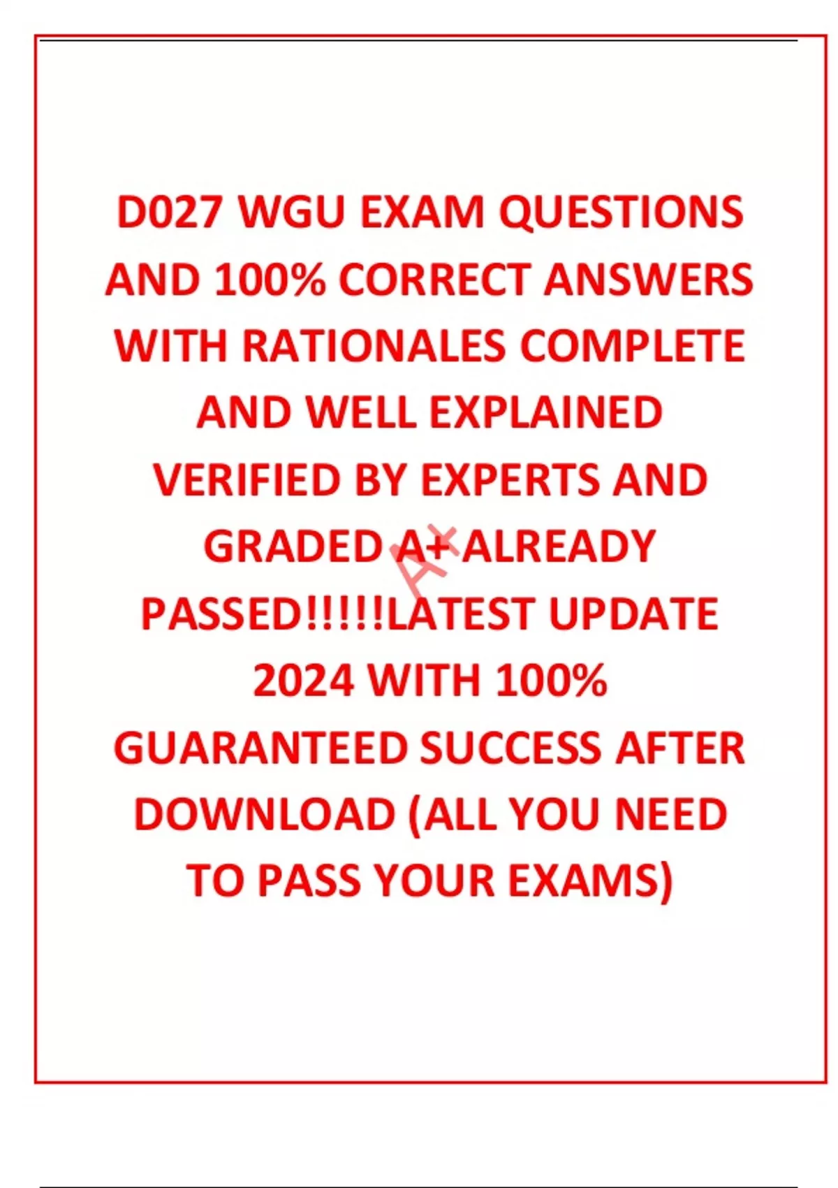 D027 WGU EXAM QUESTIONS AND 100% CORRECT ANSWERS WITH RATIONALES COMPLETE AND WELL EXPLAINED VERIFIED BY EXPERTS AND GRADED A+ ALREADY PASSED!!!!!LATEST UPDATE 2024 WITH 100% GUARANTEED SUCCESS AFTER DOWNLOAD (ALL YOU NEED TO PASS YOUR EXAMS) What is the gold standard for the suspected diagnosis of Celiac Disease? Endoscopy with small intestine biopsy A 44-year-old woman has recently been diagnosed with advanced metastatic non-small-cell lung cancer. Genetic testing is ordered to determine if the patient's tumor has any genomic alterations and to guide treatment decisions. A few weeks later, the patient's test results come back positive for a genetic mutation. The APN starts osimertinib (Tagrisso). Based on this information, what type of genetic mutation does this patient have? EGFR mutation A 20-year-old male meets with an advanced professional nurse (APN) to discuss symptoms that have been slowly progressing over the past several years. He is mainly concerned because he has been falling frequently. Since childhood, his gait has consisted of walking on his toes. During middle school, he was able to participate in sports but was unable to participate in high school sports due to difficulty with running and jumping. Lately, he has noticed it takes longer and is more difficult to change positions from sitting to standing than it used to in the past. He has also been waking up with muscle and joint stiffness. The APRN notes that his family history is not significant for any chronic or genetic diseases. Which condition is likely to be the cause of these symptoms? Becker muscular dystrophy --Becker muscular dystrophy (often called Becker MD or BMD) is a form of muscular dystrophy, a genetic disorder that gradually makes the body's muscles weaker and smaller. It causes less severe problems than the most common type, Duchenne muscular dystrophy. Which statement should the provider give the patient regarding the pathophysiology of SLE and its relation to thrombocytopenia? SLE disrupts immune homeostasis and promotes development of self-reactive antibodies. A female patient presents to an office to establish care. Her previous primary care provider told her to follow up regarding an elevated ferritin level. She has no previous medical history and is currently asymptomatic. She is concerned about the elevated ferritin and would like to know if she should be worried. What should the provider do next for this patient? Order a liver function test