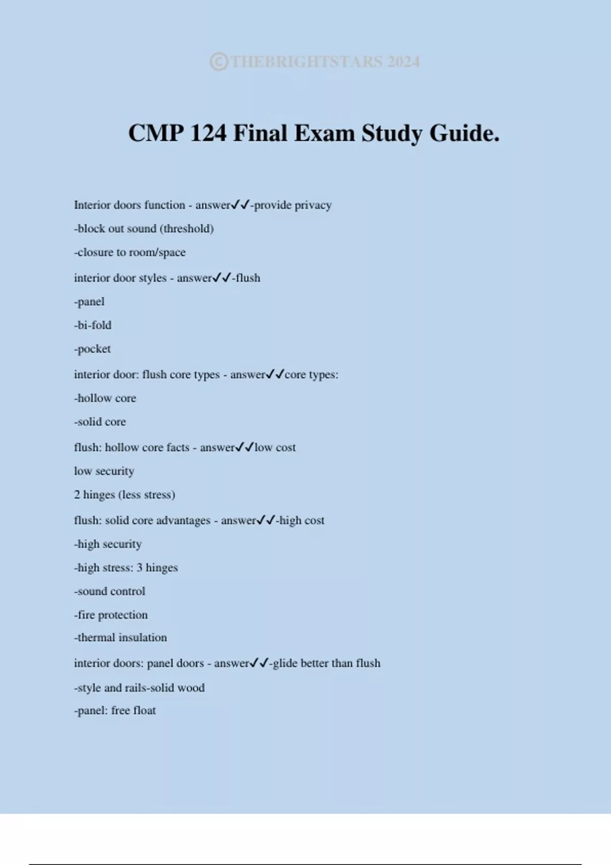 CMP 124 Final Exam Study Guide. Interior doors function - answer-provide privacy -block out sound (threshold) -closure to room/space interior door styles - answer-flush -panel -bi-fold -pocket interior door: flush core types - answercore types: -hollow core -solid core flush: hollow core facts - answerlow cost low security 2 hinges (less stress) flush: solid core advantages - answer-high cost -high security -high stress: 3 hinges -sound control -fire protection -thermal insulation interior doors: panel doors - answer-glide better than flush -style and rails-solid wood -panel: free float ©THEBRIGHTSTARS 2024 interior doors: bi-fold - answerhalf swing area interior doors: pocket - answertrack on top interior door thickness- size - answer1 3/8" thick 6'-8" high exterior door thickness- size - answer1 3/4" thick 6'-8" high width: dependent on location and function of door -must be 3' 0" to make room for stretcher commercial door thickness- size - answer2" thick 7' high door hinges - answerknuckles exterior door function - answersafety (security and fire) thermal insulation weather protection (threshold and seals) appearance thickness exterior door material - answer-steel -wood -fiber glass steel door advantages (exterior): - answerdurable fire rated low cost security light weight (ga 20-26 res, ga 14-22 comm