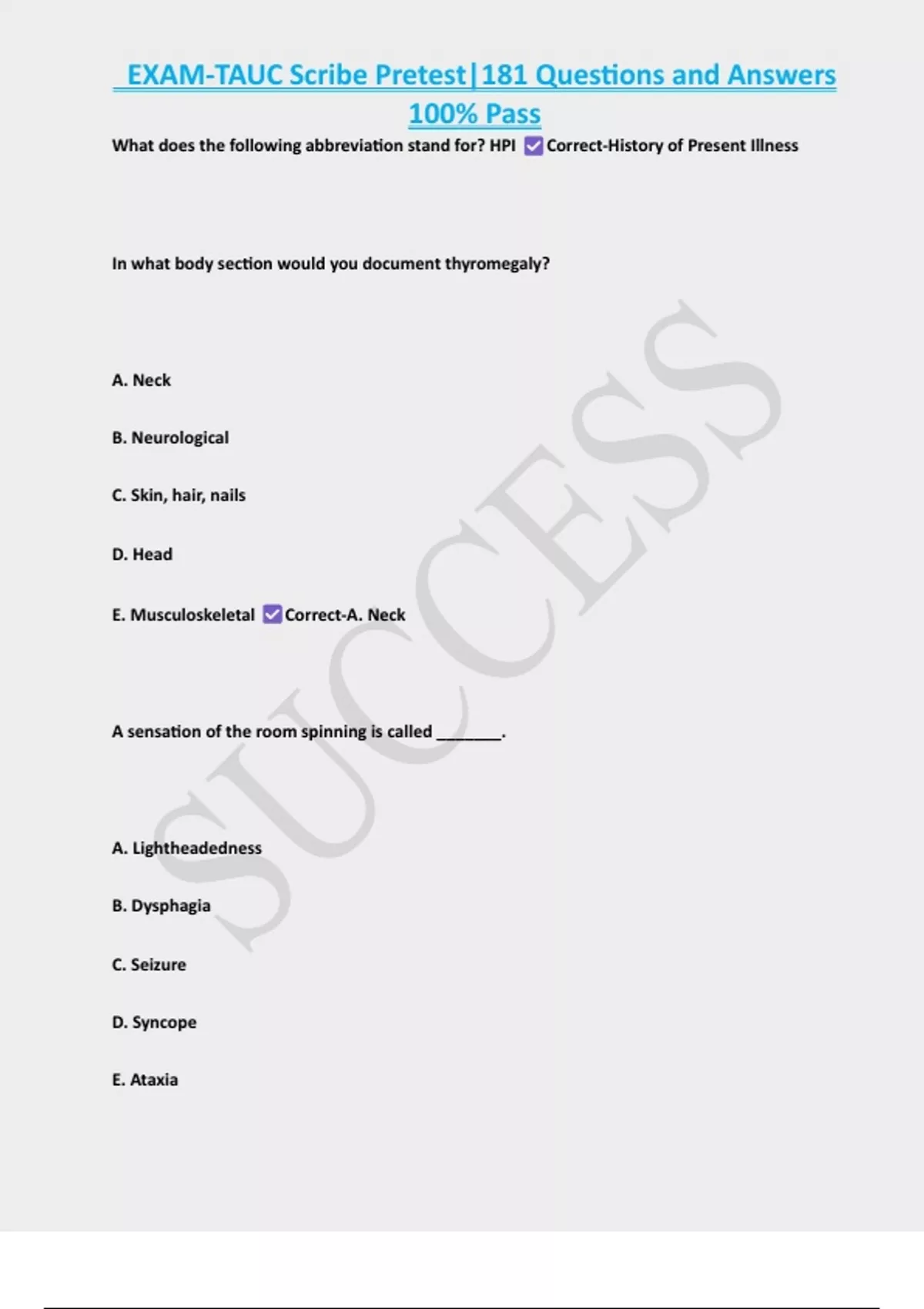 EXAM-TAUC Scribe Pretest|181 Questions and Answers 100% Pass What does the following abbreviation stand for? HPI Correct-History of Present Illness In what body section would you document thyromegaly? A. Neck B. Neurological C. Skin, hair, nails D. Head E. Musculoskeletal Correct-A. Neck