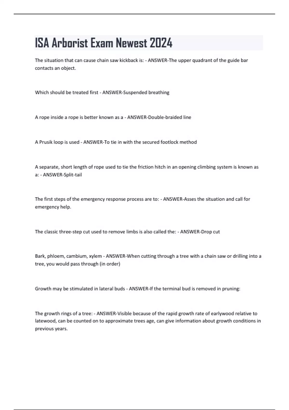 ISA Arborist Exam Newest 2024 The situation that can cause chain saw kickback is: - ANSWER-The upper quadrant of the guide bar contacts an object. Which should be treated first - ANSWER-Suspended breathing A rope inside a rope is better known as a - ANSWER-Double-braided line A Prusik loop is used - ANSWER-To tie in with the secured footlock method A separate, short length of rope used to tie the friction hitch in an opening climbing system is known as a: - ANSWER-Split-tail The first steps of the emergency response process are to: - ANSWER-Asses the situation and call for emergency help. The classic three-step cut used to remove limbs is also called the: - ANSWER-Drop cut Bark, phloem, cambium, xylem - ANSWER-When cutting through a tree with a chain saw or drilling into a tree, you would pass through (in order) Growth may be stimulated in lateral buds - ANSWER-If the terminal bud is removed in pruning: The growth rings of a tree: - ANSWER-Visible because of the rapid growth rate of earlywood relative to latewood, can be counted on to approximate trees age, can give information about growth conditions in previous years. Cambium - ANSWER-layer of cells is responsible for outward growth and increased girth of tree. Mycorrhizae are: - ANSWER-A symbiotic relationship between fungi and roots. Douglas-fir (Pseudotsuga menziesii) differs from balsam fir (Abies balsamea) in that: - ANSWER-They are not in the same genus.