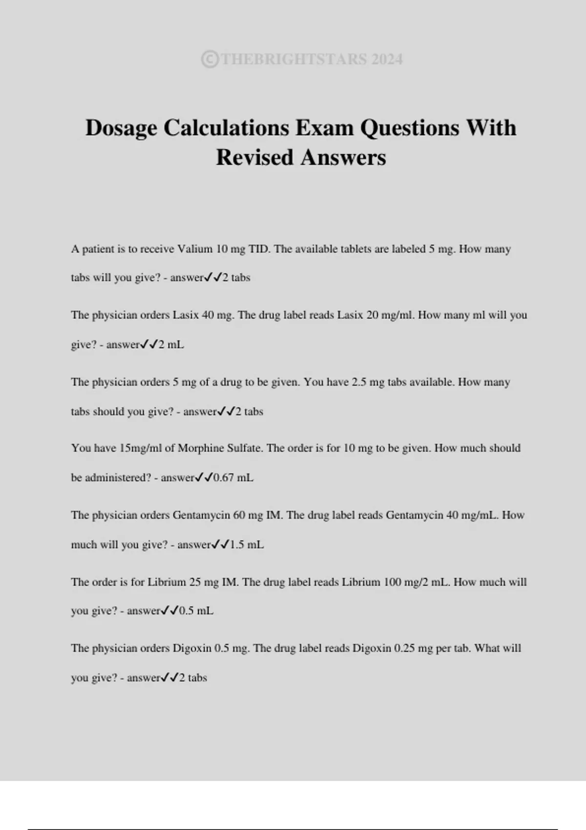 Dosage Calculations Exam Questions With Revised Answers A patient is to receive Valium 10 mg TID. The available tablets are labeled 5 mg. How many tabs will you give? - answer2 tabs The physician orders Lasix 40 mg. The drug label reads Lasix 20 mg/ml. How many ml will you give? - answer2 mL The physician orders 5 mg of a drug to be given. You have 2.5 mg tabs available. How many tabs should you give? - answer2 tabs You have 15mg/ml of Morphine Su