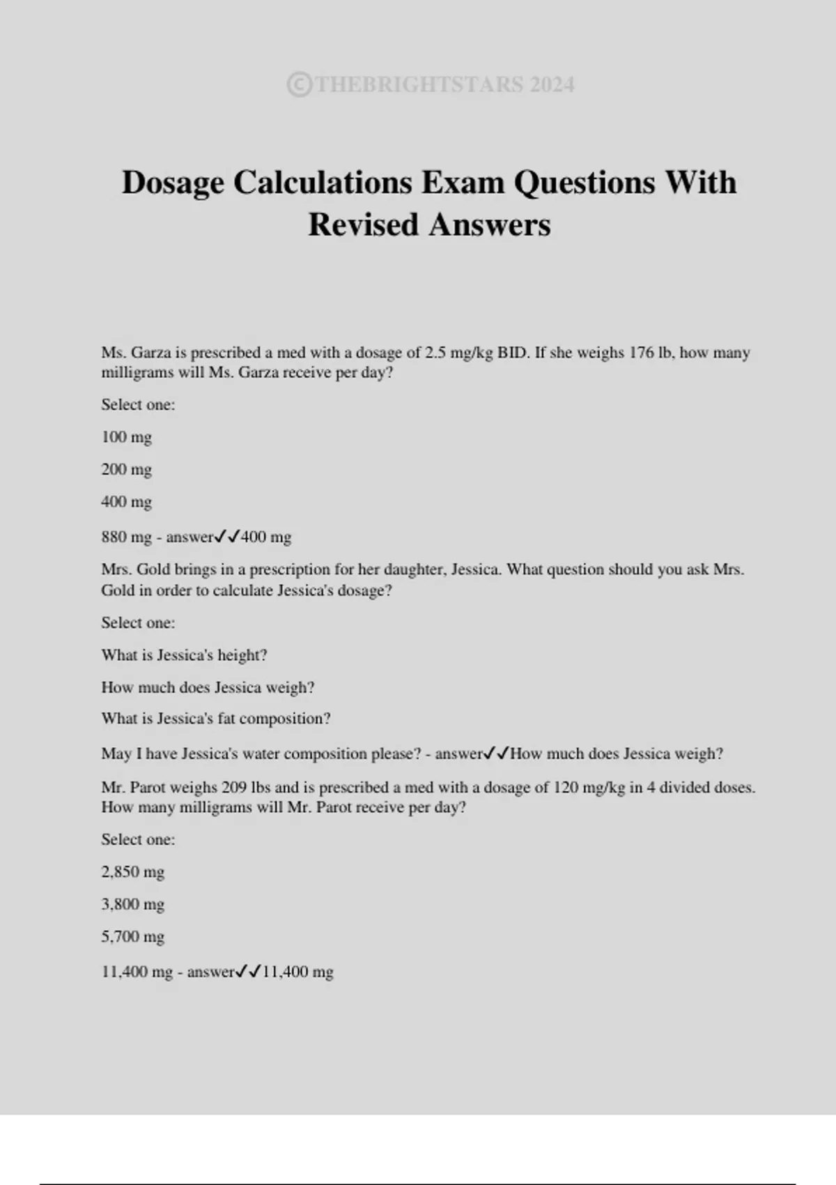 Dosage Calculations Exam Questions With Revised Answers Ms. Garza is prescribed a med with a dosage of 2.5 mg/kg BID. If she weighs 176 lb, how many milligrams will Ms. Garza receive per day? Select one: 100 mg 200 mg 400 mg 880 mg - answer400 mg Mrs. Gold brings in a prescription for her daughter, Jessica. What question should you ask Mrs. Gold in order to calculate Jessica's dosage? Select one: What is Jessica's height? How much does Jessica weigh? What is Jessica's fat composition? May I have Jessica's water composition please? - answerHow much does Jessica weigh? Mr. Parot weighs 209 lbs and is prescribed a med with a dosage of 120 mg/kg in 4 divided doses. How many milligrams will Mr. Parot receive per day? Select one: 2,850 mg 3,800 mg 5,700 mg 11,400 mg - answer11,400 mg ©THEBRIGHTSTARS 2024 Olivia is ordered cephalexin 25 mg/kg PO every 12 hours for 7 days. She weighs 25 kg. How many milligrams will Olivia receive per dose? Select one: 284 mg 625 mg 1,250 mg 1,375 mg - answer625 mg Mr. Doran is prescribed methotrexate. The dosage range of the med for his condition is 0.625 - 2.5 mg/kg/day. If he weighs 165 lb, what is the range
