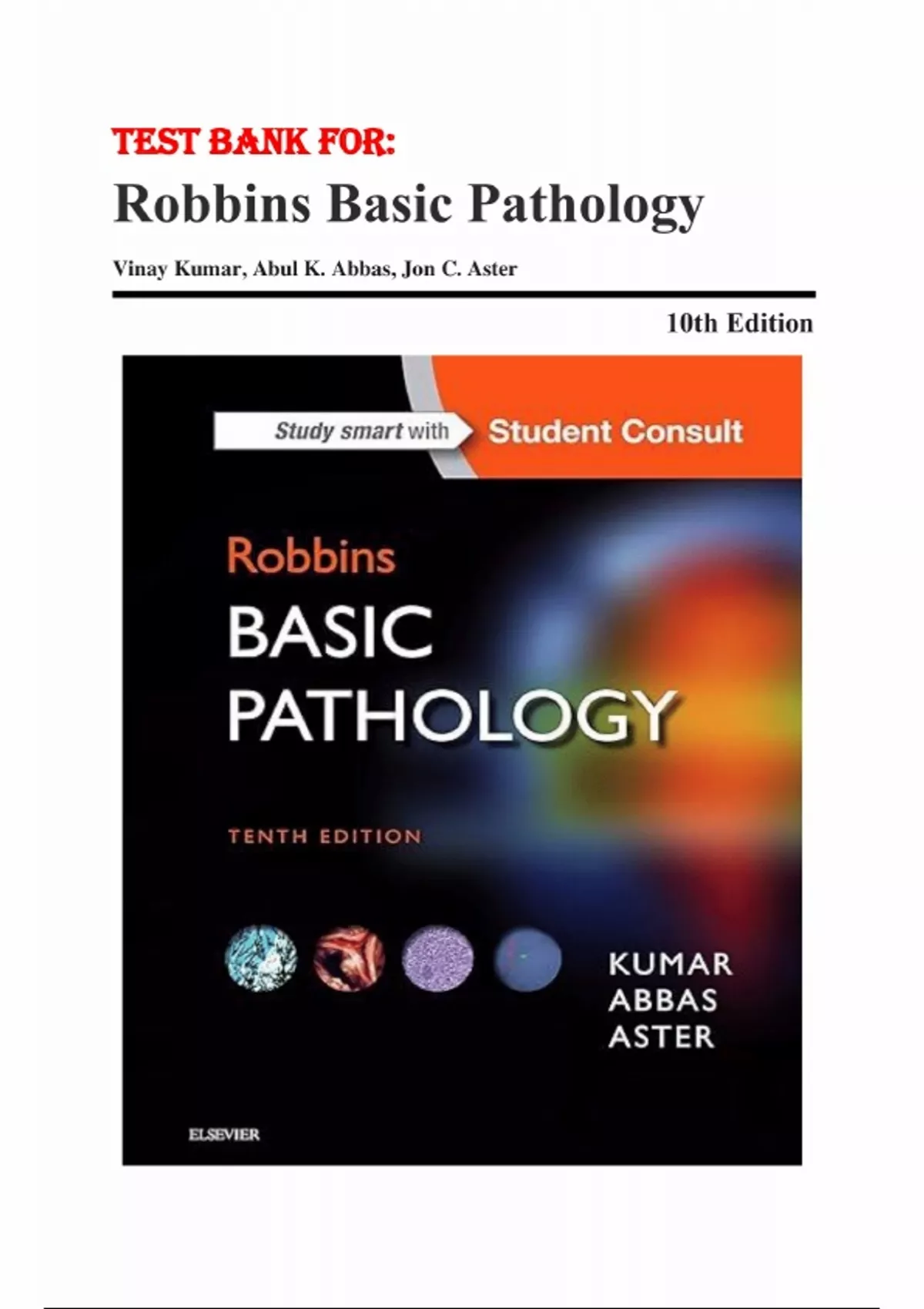 Test Bank for Robbins Basic Pathology 10th Edition by Vinay Kumar, Abul K. Abba & Jon C. Aster 9780323353175 Chapter 1-24 | Complete Guide A+. Table of Contents Chapter 1. The Cell as a Unit of Health and Disease Chapter 2. Cell Injury, Cell Death, and Adaptations Chapter 3. Inflammation and Repair Chapter 4. Hemodynamic Disorders, Thromboembolism, and Shock Chapter 5 Diseases of the Immune System Chapter 6 Neoplasia Chapter 7. Genetic and Pediatric Diseases Chapter 8. Environmental and Nutritional Diseases Chapter 9. General Pathology of Infectious Diseases Chapter 10. Blood Vessels Chapter 11. Heart Chapter 12. Hematopoietic and Lymphoid Systems Chapter 13. Lung Chapter 14. Kidney and Its Collecting System Chapter 15. Oral Cavities and Gastrointestinal Tract Chapter 16. Liver and Gallbladder Chapter 17. Pancreas Chapter 18. Male Genital System and Lower Urinary Tract Chapter 19. Female Genital System and Breast Chapter 20. Endocrine System Chapter 21. Bones, Joints, and Soft Tissue Tumors Chapter 22. Peripheral Nerves and Muscles Chapter 23. Central Nervous System Chapter 24. Skin