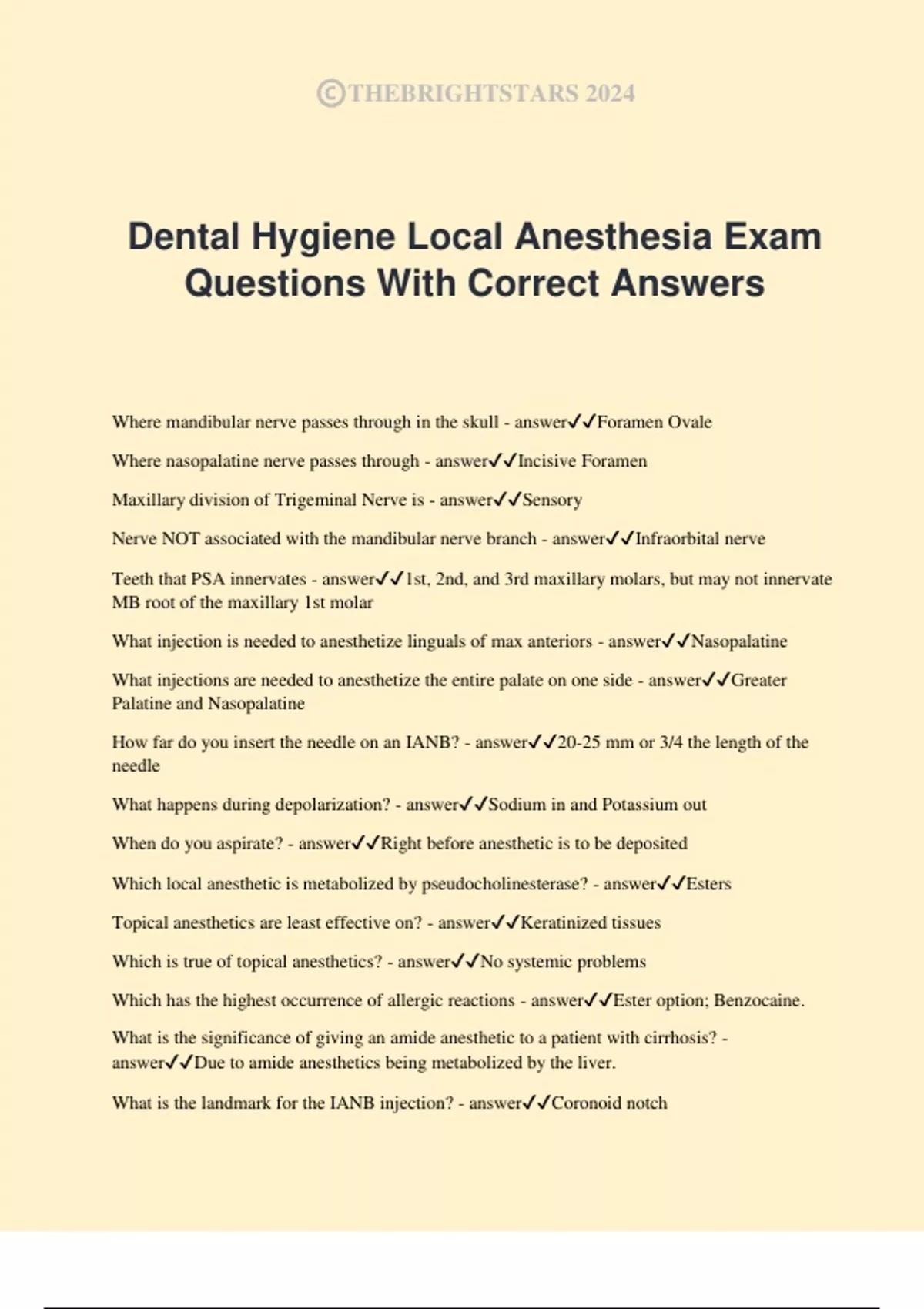 ©THEBRIGHTSTARS 2024 Dental Hygiene Local Anesthesia Exam Questions With Correct Answers Where mandibular nerve passes through in the skull - answerForamen Ovale Where nasopalatine nerve passes through - answerIncisive Foramen Maxillary division of Trigeminal Nerve is - answerSensory Nerve NOT associated with the mandibular nerve branch - answerInfraorbital nerve Teeth that PSA innervates - answer1st, 2nd, and 3rd maxillary molars, but may not innervate MB root of the maxillary 1st molar What injection is needed to anesthetize linguals of max anteriors - answerNasopalatine What injections are needed to anesthetize the entire palate on one side - answerGreater Palatine and Nasopalatine How far do you insert the needle on an IANB? - answer20-25 mm or 3/4 the length of the needle What happens during depolarization? - answerSodium in and Potassium out When do you aspirate? - answerRight before anesthetic is to be deposited Which local anesthetic is metabolized by pseudocholinesterase? - answerEsters Topical anesthetics are least effective on? - answerKeratinized tissues Which is true of topical anesthetics? - answerNo systemic problems Which has the highest occurrence of allergic reactions - answerEster option; Benzocaine. What is the significance of giving an amide anesthetic to a patient with cirrhosis? - answerDue to amide anesthetics being metabolized by the liver. What is the landmark for the IANB injection? - answerCoronoid notch