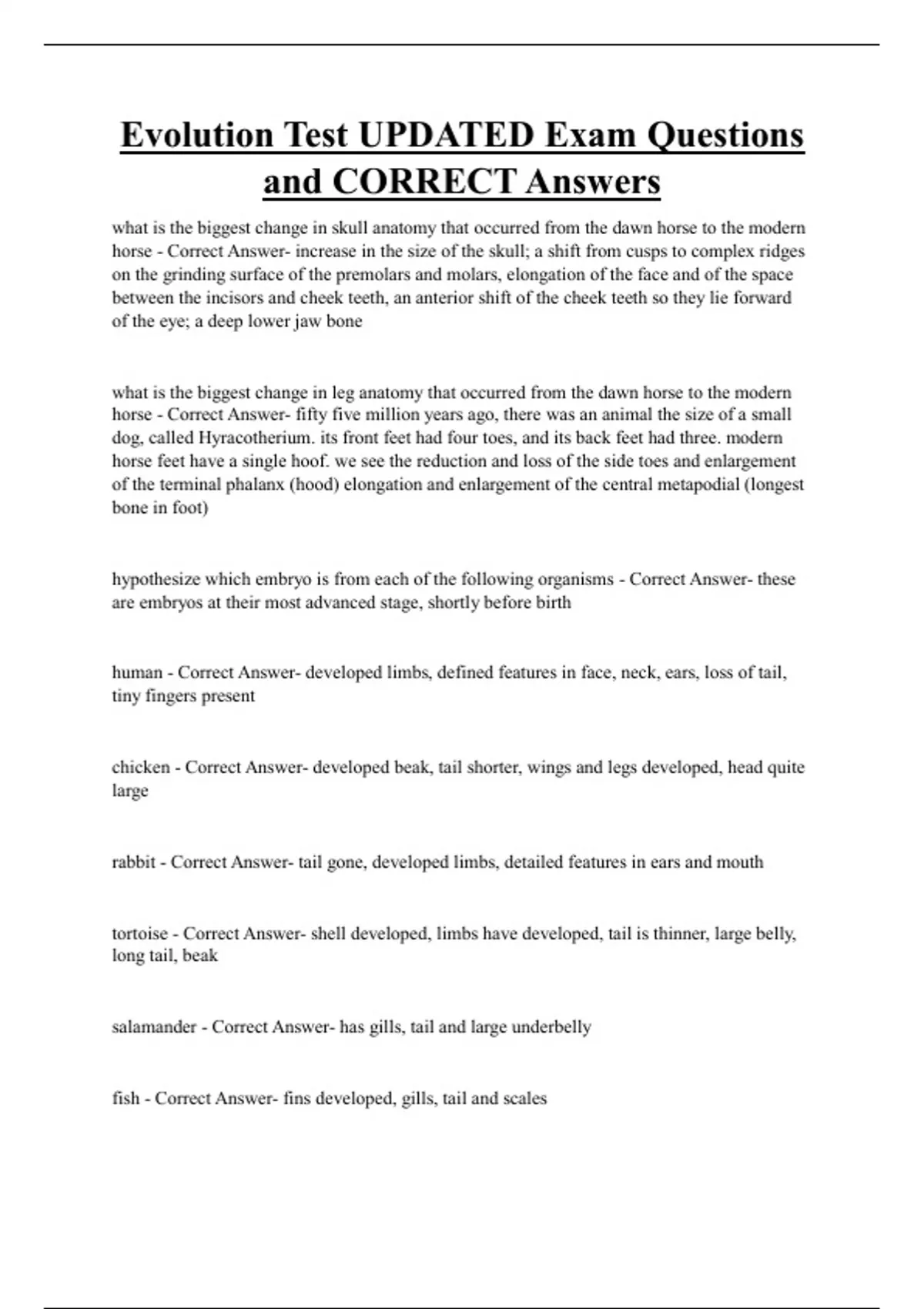 Evolution Test UPDATED Exam Questions and CORRECT Answers what is the biggest change in skull anatomy that occurred from the dawn horse to the modern horse - Correct Answer- increase in the size of the skull; a shift from cusps to complex ridges on the grinding surface of the premolars and molars, elongation of the face and of the space between the incisors and cheek teeth, an anterior shift of the cheek teeth so they lie forward of the eye; a deep lower jaw bone