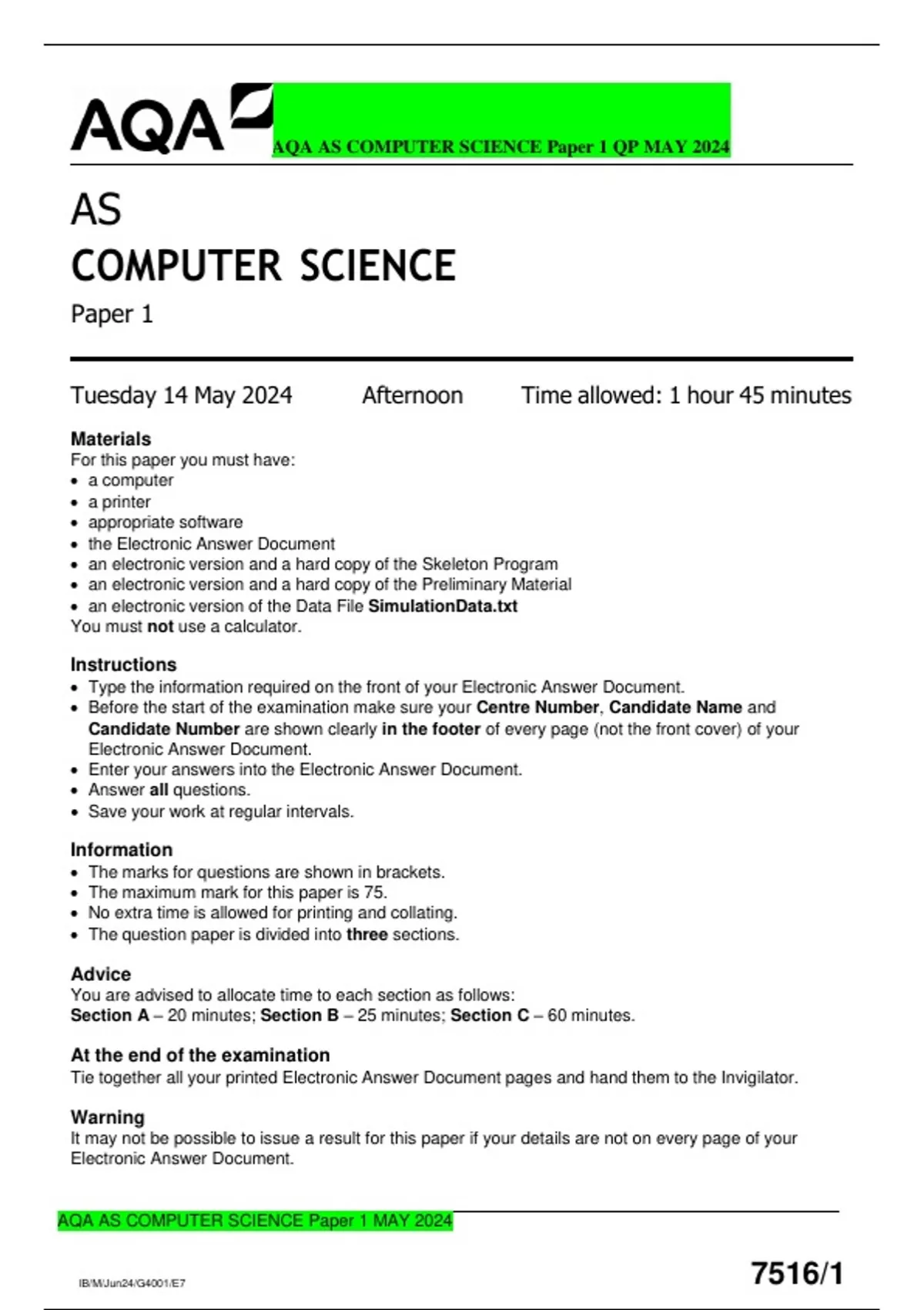 AQA AS COMPUTER SCIENCE Paper 1 MAY 2024