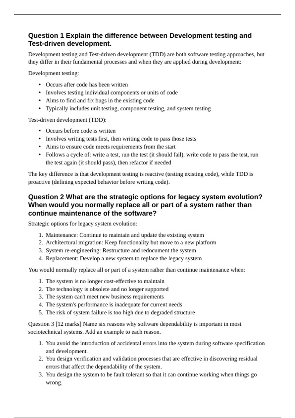 INF3705 Assignment 2 solution 2024 Question 1 100 [15 marks] Explain the difference between Development testing and Test-driven development. Question 2 [09 marks] What are the strategic options for legacy system evolution? When would you normally replace all or part of a system rather than continue maintenance of the software? Question3 [12 marks] Name six reasons why software dependability is important in most sociotechnical systems. Add an example to each reason. Question 4 [11 marks] Describe three (3) different types of fault-tolerance architectures. What is the common characteristic of all architectural styles that are geared to supporting software fault tolerance? Question 5 [15 marks] Discuss what safety engineering processes are and discuss (in detail) four (4) safety engineering processes. Question 6 [08 marks] Give four circumstances (plus examples) where you might recommend against software reuse. Question 7 [12 marks] List and explain the key stages in the process of system construction by composition. 2INF3705/202/1/2024 Question 8 [10 marks] Why is system evolution inherently costly? Question 09 [08 marks] If you are the Software Engineering Manager in your own organization, what four (4) Software Engineering concepts (plus the reason), taught to you in INF3705, will be the most important ones that you will expect from the different Software Engineering teams working for you.