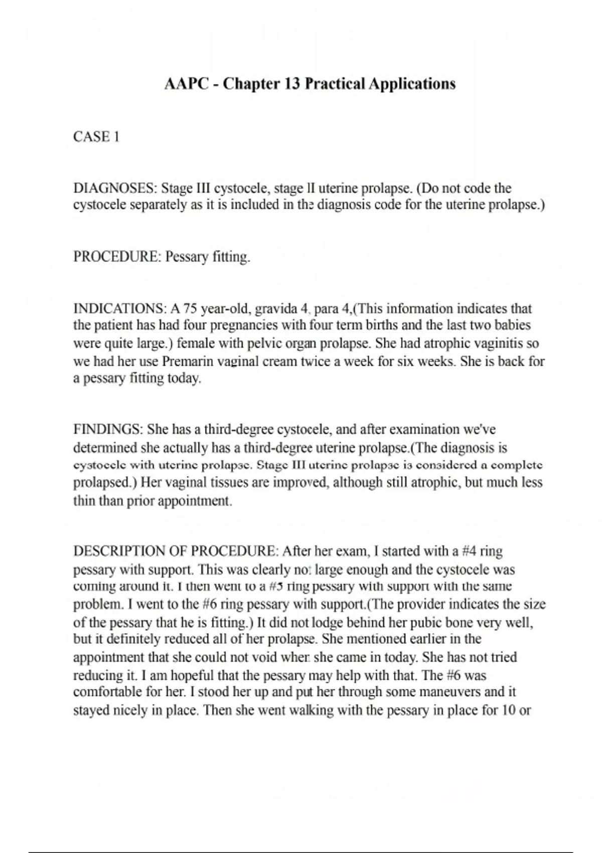 CASE 1 DIAGNOSES: Stage III cystocele, stage II uterine prolapse. (Do not code the cystocele separately as it is included in the diagnosis code for the uterine prolapse.) PROCEDURE: Pessary fitting. INDICATIONS: A 75 year-old, gravida 4, para 4,(This information indicates that the patient has had four pregnancies with four term births and the last two babies were quite large.) female with pelvic organ prolapse. She had atrophic vaginitis so we had her use Premarin vaginal cream twice a week for six weeks. She is back for a pessary fitting today. FINDINGS: She has a third-degree cystocele, and after examination we've determined she actually has a third-degree uterine prolapse.(The diagnosis is cystocele with uterine prolapse. Stage III uterine prolapse is considered a complete prolapsed.) Her vaginal tissues are improved, although still atrophic, but much less thin than prior appointment. DESCRIPTION OF PROCEDURE: After her exam, I started with a #4 ring pessary with support. This was clearly not large enough and the cystocele was coming around it. I then went to a #5 ring pessary with support with the same problem. I went to the #6 ring pessary with support.(The provider indicates the size of the pessary that he is fitting.) It did not lodge behind her pubic bone very well, but it definitely reduced all of her prolapse. She mentioned earlier in the appointment that she could not void when she came in today. She has not tried reducing it. I am hopeful that the pessary may help with that. The #6 was comfortable for her. I stood her up and put her through some maneuvers and it stayed nicely in place. Then she went walking with the pessary in place for 10 or 15 minutes and went up and down the stairs. She definitely was able to void more easily with it in. It was comfortable and she did not really notice it was in.