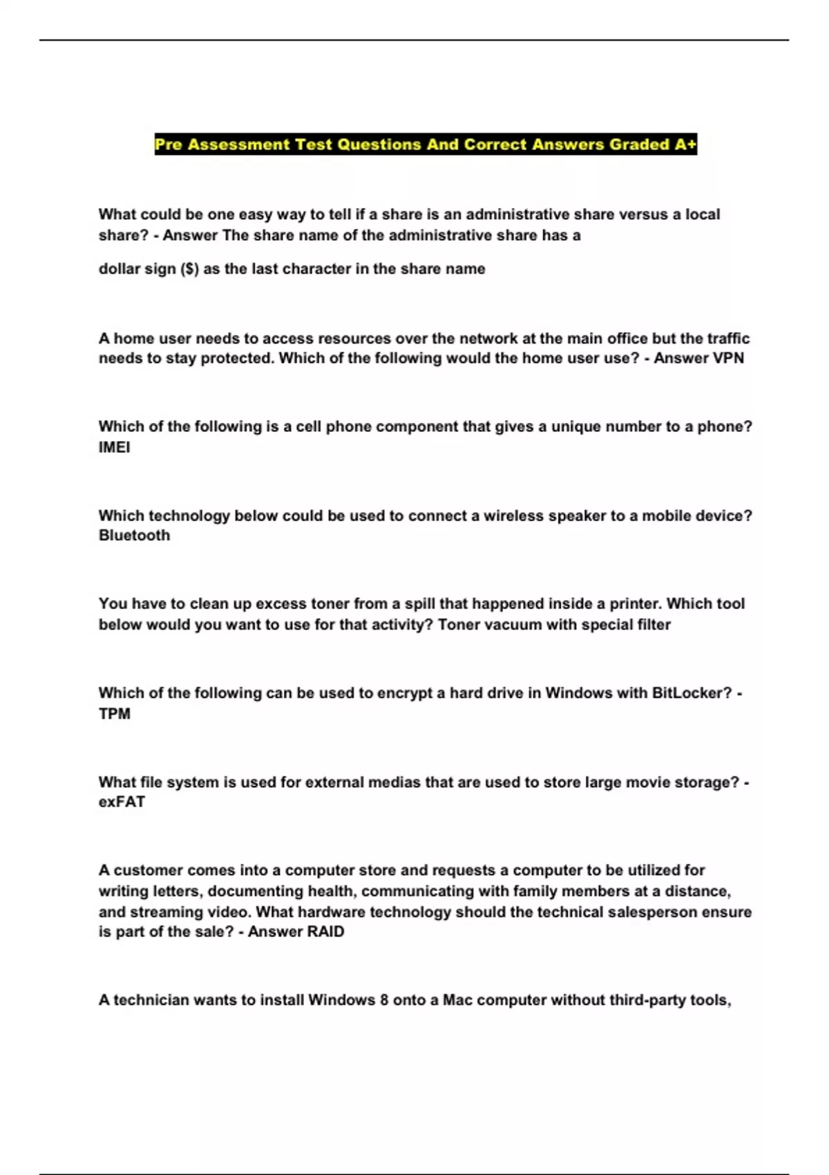 Pre Assessment Test Questions And Correct Answers Graded A+...