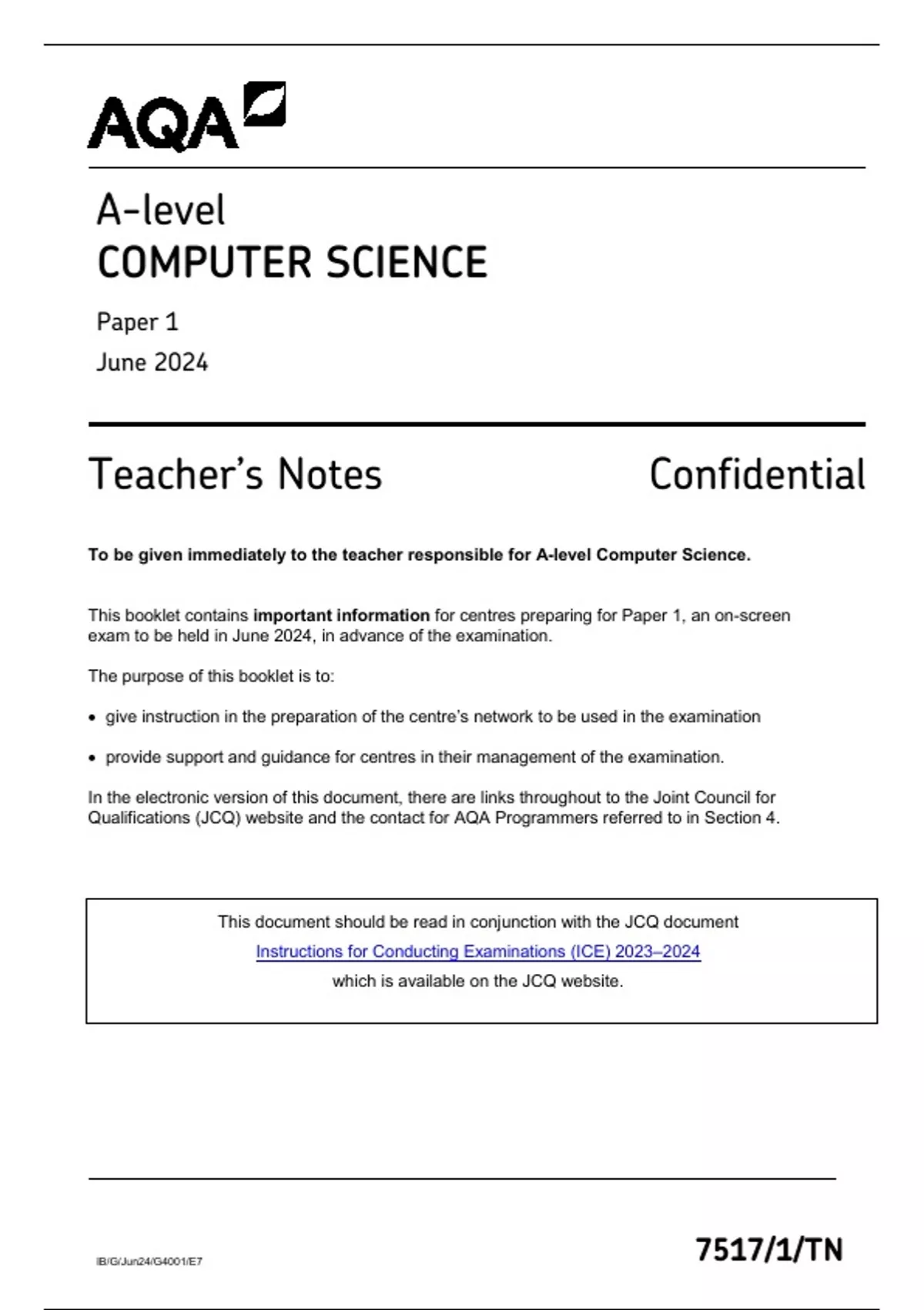 The Paper 1 Question Paper (7517/1), generic for all programming languages, will be sent in hard