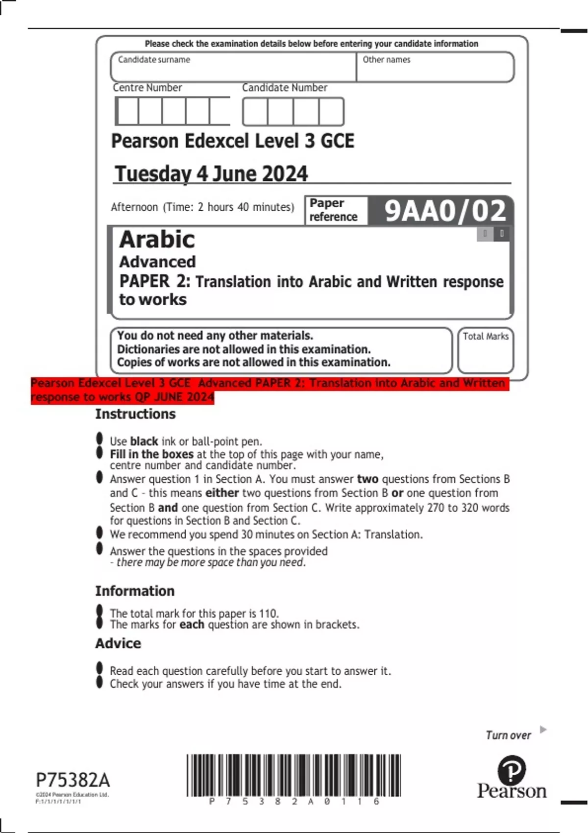 Pearson Edexcel Level 3 GCE Advanced PAPER 2: Translation into Arabic and Written
