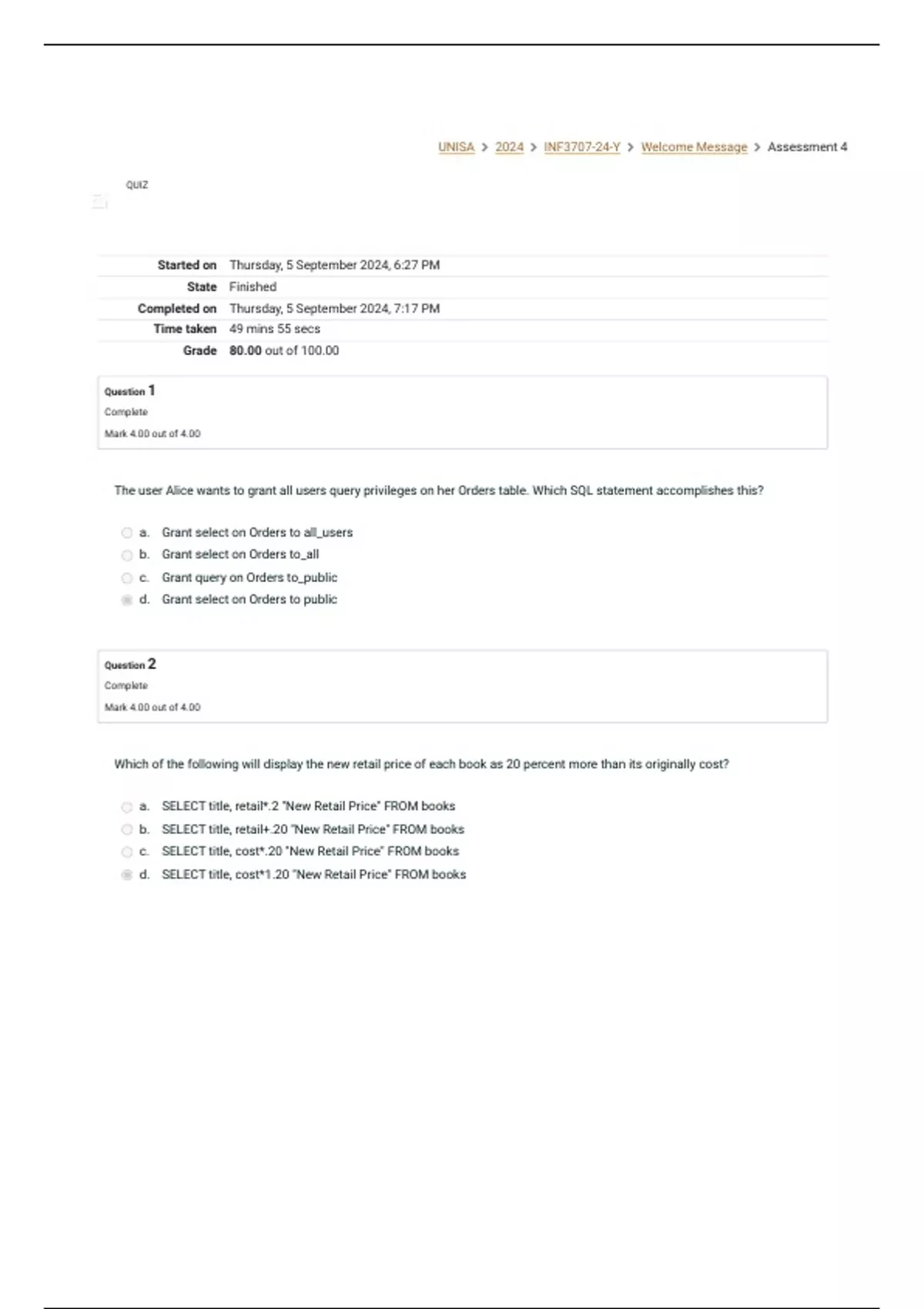 UNISA  2024  INF3707-24-Y  Welcome Message  Assessment 4