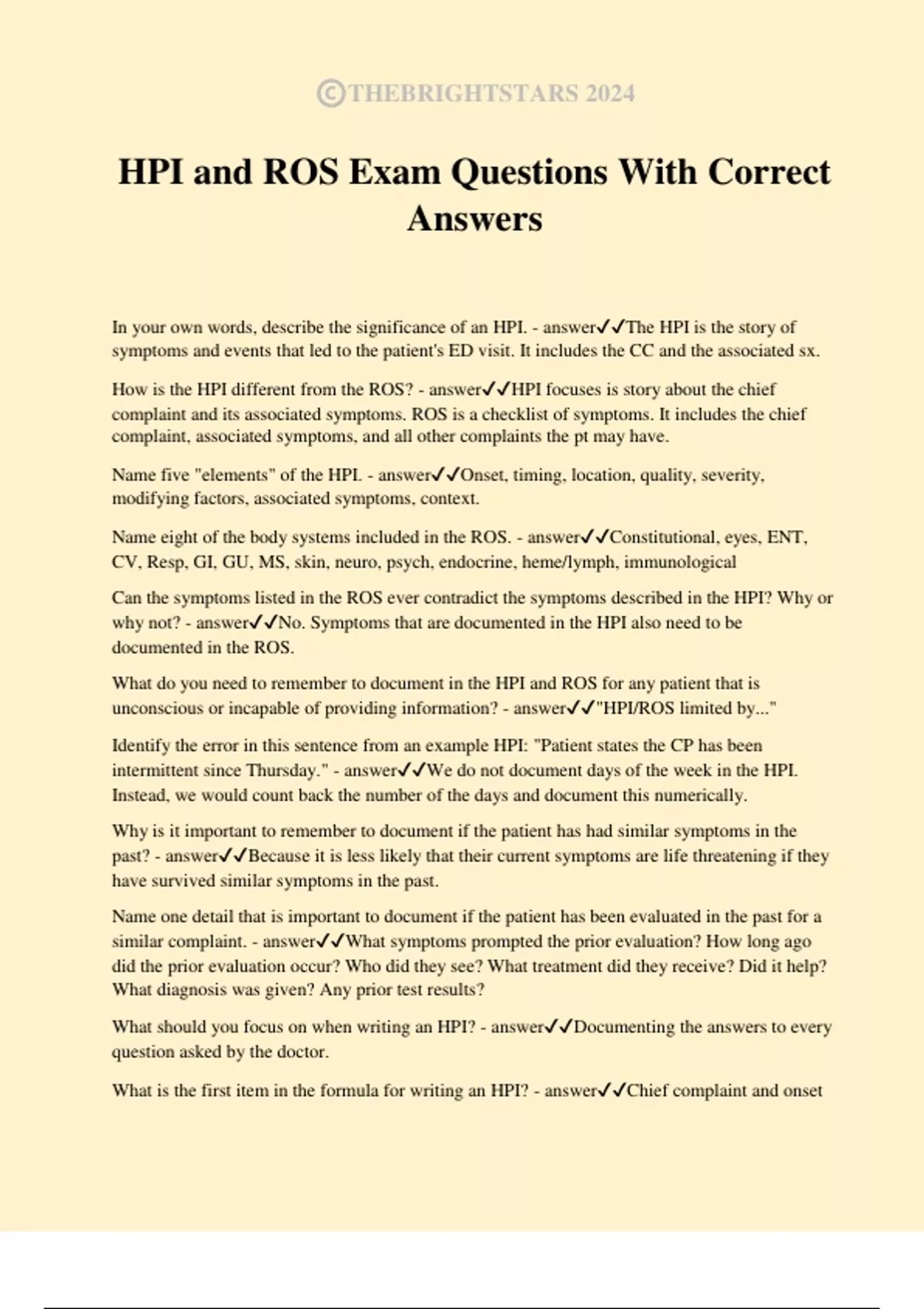 HPI and ROS Exam Questions With Correct Answers In your own words, describe the significance of an HPI. - answerThe HPI is the story of symptoms and events that led to the patient's ED visit. It includes the CC and the associated sx. How is the HPI different from the ROS? - answerHPI focuses is story about the chief complaint and its associated symptoms. ROS is a checklist of symptoms. It includes the chief complaint, associated symptoms, and all other complaints the pt may have. Name five "elements" of the HPI. - answerOnset, timing, location, quality, severity, modifying factors, associated symptoms, context. Name eight of the body systems included in the ROS. - answerConstitutional, eyes, ENT, CV, Resp, GI, GU, MS, skin, neuro, psych, endocrine, heme/lymph, immunological Can the symptoms listed in the ROS ever contradict the symptoms described in the HPI? Why or why not? - answerNo. Symptoms that are documented in the HPI also need to be documented in the ROS.