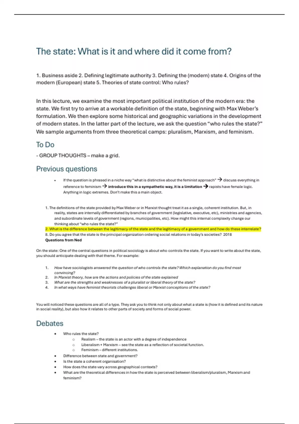 modern (European) state 5. Theories of state control: Who rules?
