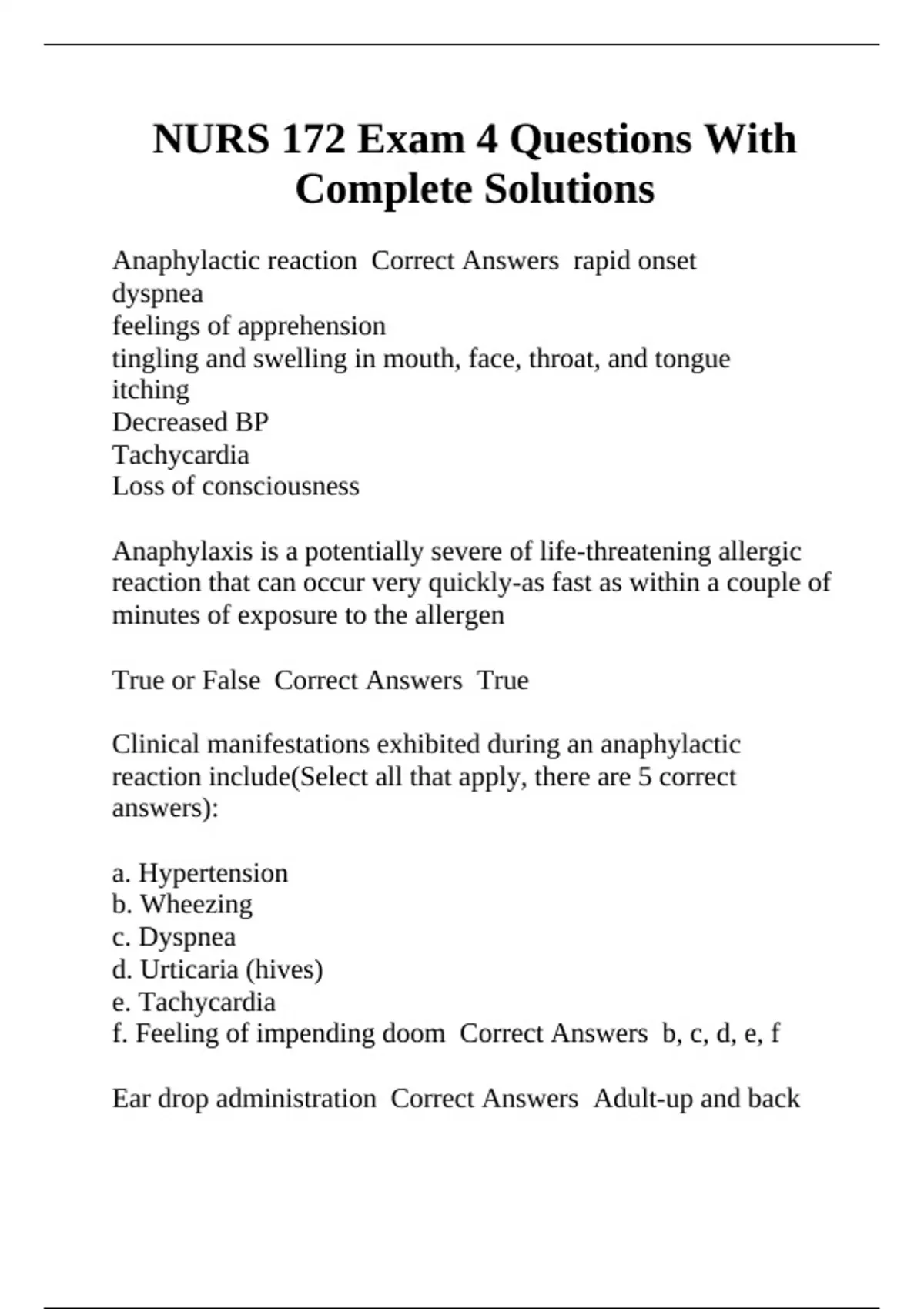 Anaphylactic reaction Correct Answers rapid onset