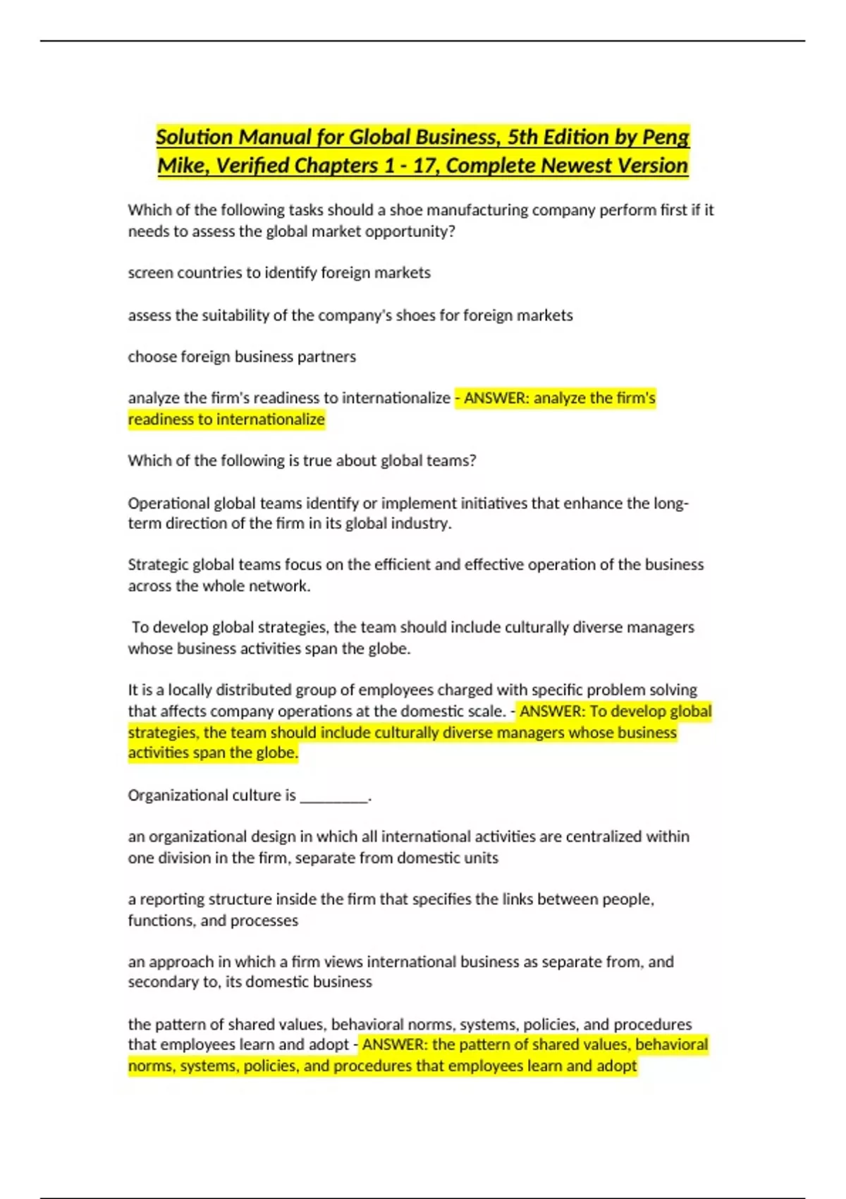 Solution Manual for Global Business, 5th Edition by Peng