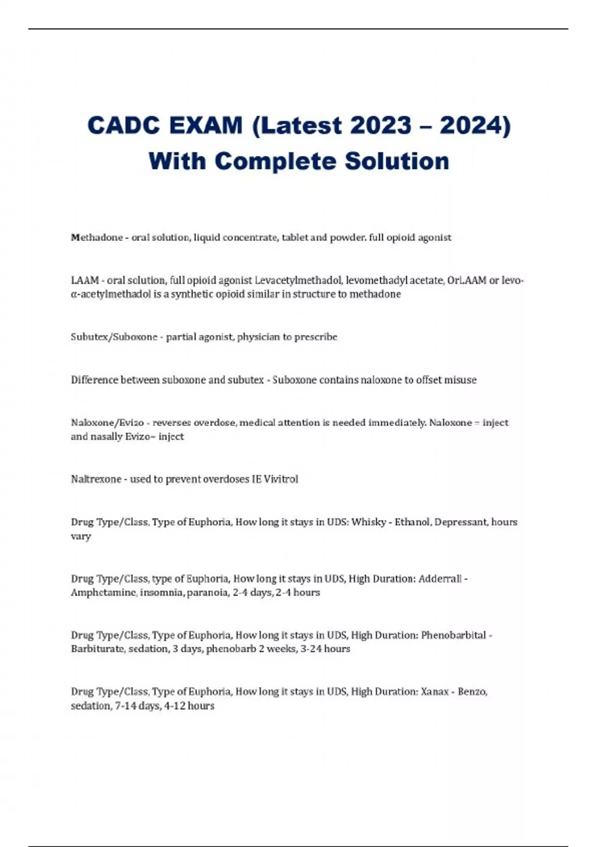 CADC EXAM (Latest 2023 – 2024) With Complete Solution Methadone - oral solution, liquid concentrate, tablet and powder. full opioid agonist LAAM - oral solution, full opioid agonist Levacetylmethadol, levomethadyl acetate, OrLAAM or levo α-acetylmethadol is a synthetic opioid similar in structure to methadone Subutex/Suboxone - partial agonist, physician to prescribe Difference between suboxone and subutex - Suboxone contains naloxone to offset misuse Naloxone/Evizo - reverses overdose, medical attention is needed immediately. Naloxone = inject and nasally Evizo= inject Naltrexone - used to prevent overdoses IE Vivitrol Drug Type/Class, Type of Euphoria, How long it stays in UDS: Whisky - Ethanol, Depressant, hours vary Drug Type/Class, type of Euphoria, How long it stays in UDS, High Duration: Adderrall - Amphetamine, insomnia, paranoia, 2-4 days, 2-4 hours Drug Type/Class, Type of Euphoria, How long it stays in UDS, High Duration: Phenobarbital - Barbiturate, sedation, 3 days, phenobarb 2 weeks, 3-24 hours Drug Type/Class, Type of Euphoria, How long it stays in UDS, High Duration: Xanax - Benzo, sedation, 7-14 days, 4-12 hours Drug Type/Class, Type of Euphoria, How long it stays in UDS, High Duration: Cannabis - hallucinogen, altered perception/mild euphoria, up to 10 days for infrequent users, 30 days for consistent users, 2-4 hours Drug Type/Class, Type of Euphoria, How long it stays in UDS, High Duration: Cocaine - stimulant, hyperactivity, 2-3 days sometimes 3 weeks for daily users, 1-2 hours Drug Type/Class, Type of Euphoria, How long it stays in UDS, High Duration: Methadone - Opiate/Narcotic, respiratory depression, 2-4 days, 12-24 hours Drug Type/Class, Type of Euphoria, How long it stays in UDS, High Duration: Methamphetamine - Stimulant, dry mouth/tachycardia, 2-4 days, 2-4 hours- ICE but up to 24 hours Drug Type/Class, Type of Euphoria, How long it stays in UDS, High Duration: Heroin - sedation, 2-3 days, 3-6 hours Step 1 NA - We admitted that we were powerless over our addiction, that our lives have become unmanageable Step 2 NA - We came to believe that a power greater than ourselves could restore us to sanity Step 3 NA - Decision to turn our will and lives over to God as we understand him Step 4 NA - Moral Inventory Step 5 NA - Admitted to God, ourselves and another human being the exact nature of our wrongs Step 6 NA - We were entirely ready to have God remove all these defects from our character Step 7 NA - Humbly ask God to remove our shortcomings Step 8 NA - List of all persons we had harmed and became willing to make amends to them all
