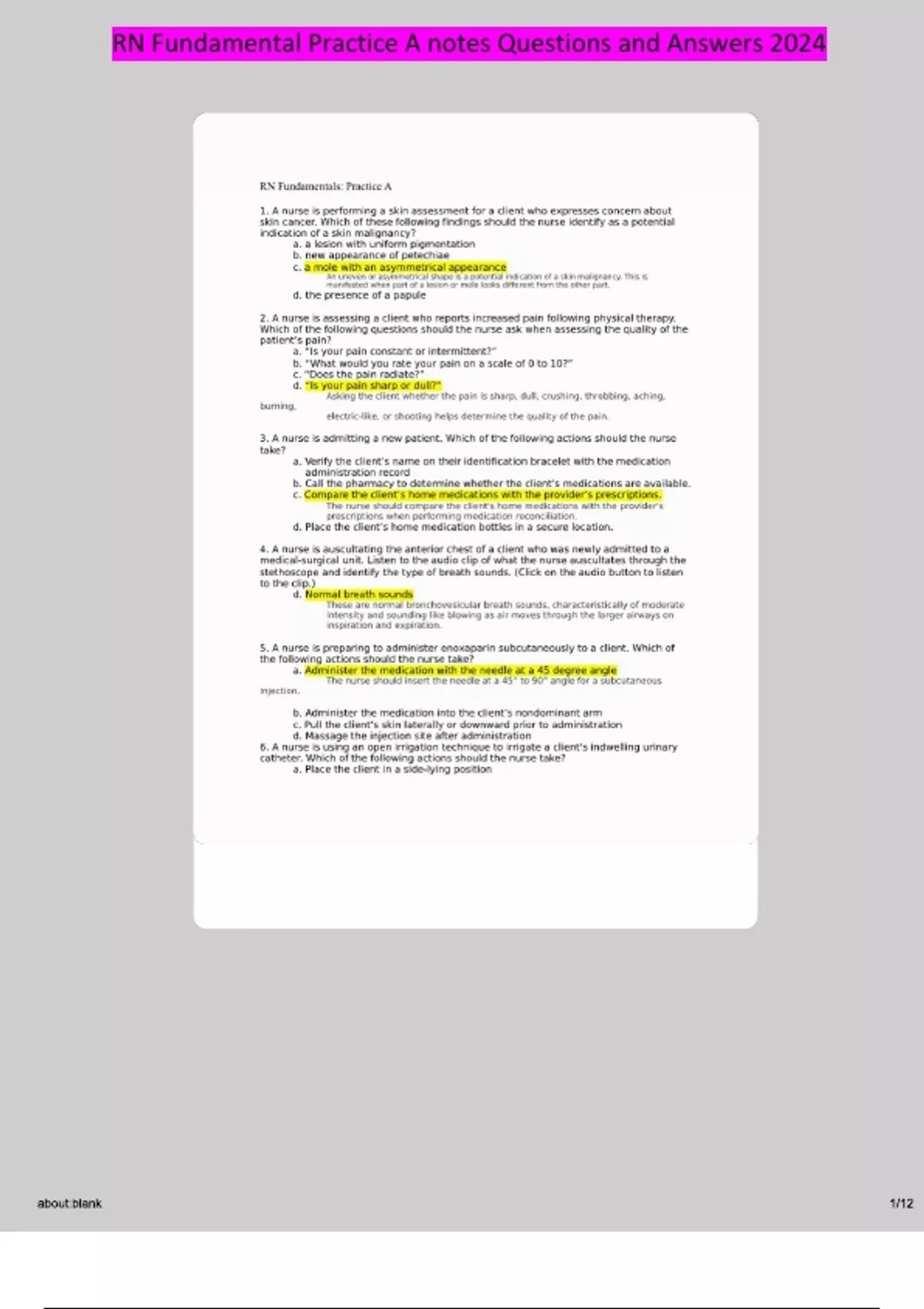 , RN Fundamental Practice A notes Questions and Answers 2024