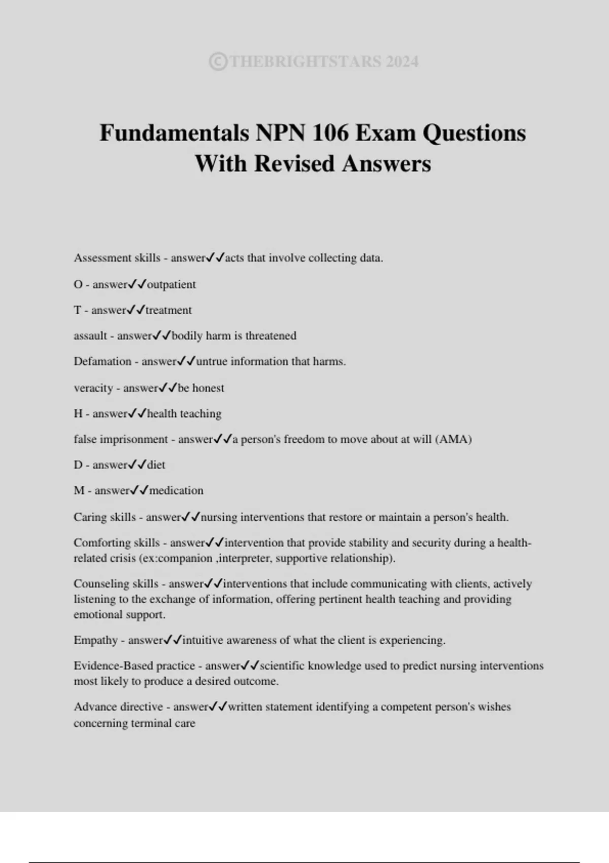 ©THEBRIGHTSTARS 2024 Fundamentals NPN 106 Exam Questions With Revised Answers Assessment skills - answeracts that involve collecting data. O - answeroutpatient T - answertreatment assault - answerbodily harm is threatened Defamation - answeruntrue information that harms. veracity - answerbe honest H - answerhealth teaching false imprisonment - answera person's freedom to move about at will (AMA) D - answerdiet M - answermedication Caring skills - answernursing interventions that restore or maintain a person's health. Comforting skills - answerintervention that provide stability and security during a health- related crisis (ex:companion ,interpreter, supportive relationship). Counseling skills - answerinterventions that include communicating with clients, actively listening to the exchange of information, offering pertinent health teaching and providing emotional support. Empathy - answerintuitive awareness of what the client is experiencing. Evidence-Based practice - answerscientific knowledge used to predict nursing interventions most likely to produce a desired outcome. Advance directive - answerwritten statement identifying a competent person's wishes concerning terminal care ©THEBRIGHTSTARS 2024 Autonomy - answera competent person's right to make his or her own choices. Board of Nursing - answerRegulatory agency that manages the provisions of a state's nurse practice act. Code status - answermanner in which nurses or health care personnel must manage the care of a client during cardiac or respiratory arrest. Living will - answera person's advance, written directive identifying medical interventions to use or not to use in cases of terminal conditions, irreversible coma, or vegetable state with no hope of recovery. Nurse Practice Act - answerstatute in each state and territory that regulates the practice of nursing Illness - answerstate of being unwell. Morbidity - answerincidence of a specific notifiable disease Mortality - answerincidence of death Acute Illness - answersuddenly and lasts a short time. Chronic Illness - answerSlowly and last a long time. Terminal Illness - answerno potential for cure. Sequelae - answerconsequences of a disease or its treatment Primary illness - answerone that develops independently of any other disease Secondary Illness - answerdisorder that develops from a preexisting condition Remission - answerdisappearance of signs and symptoms of disease Exacerbation - answerreactivation of a disorder, or one that reverts from a chronic to an acute state Hereditary illness - answerdisorder acquired from the genetic codes of one or both parents. Congenital illness - answerdisorder present at birth that results from faulty embryonic development. Idiopathic illness - answerone in which the cause is unexplained Continuity of Care - answeruninterrup