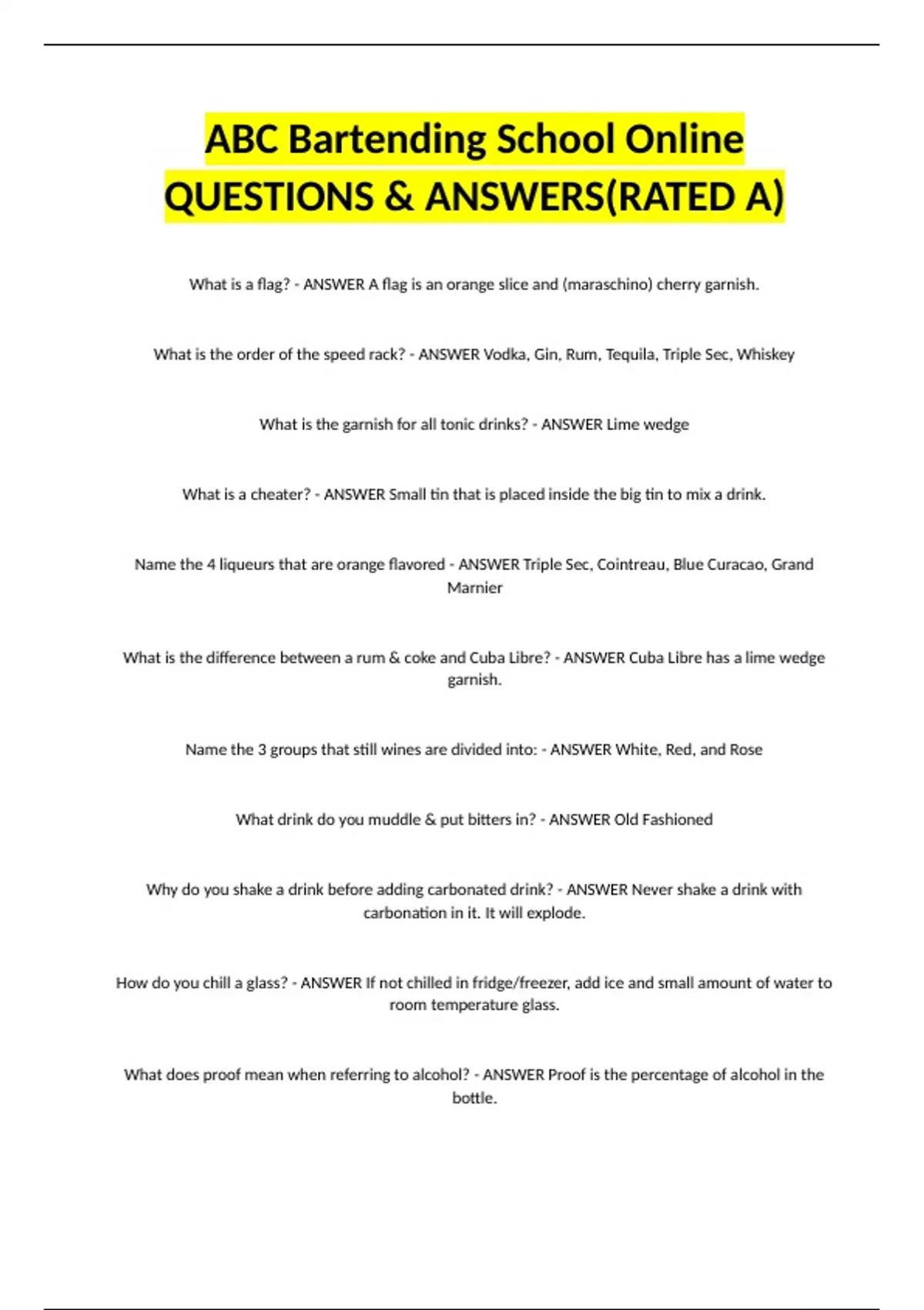 ABC Bartending School Online QUESTIONS & ANSWERS(RATED A)