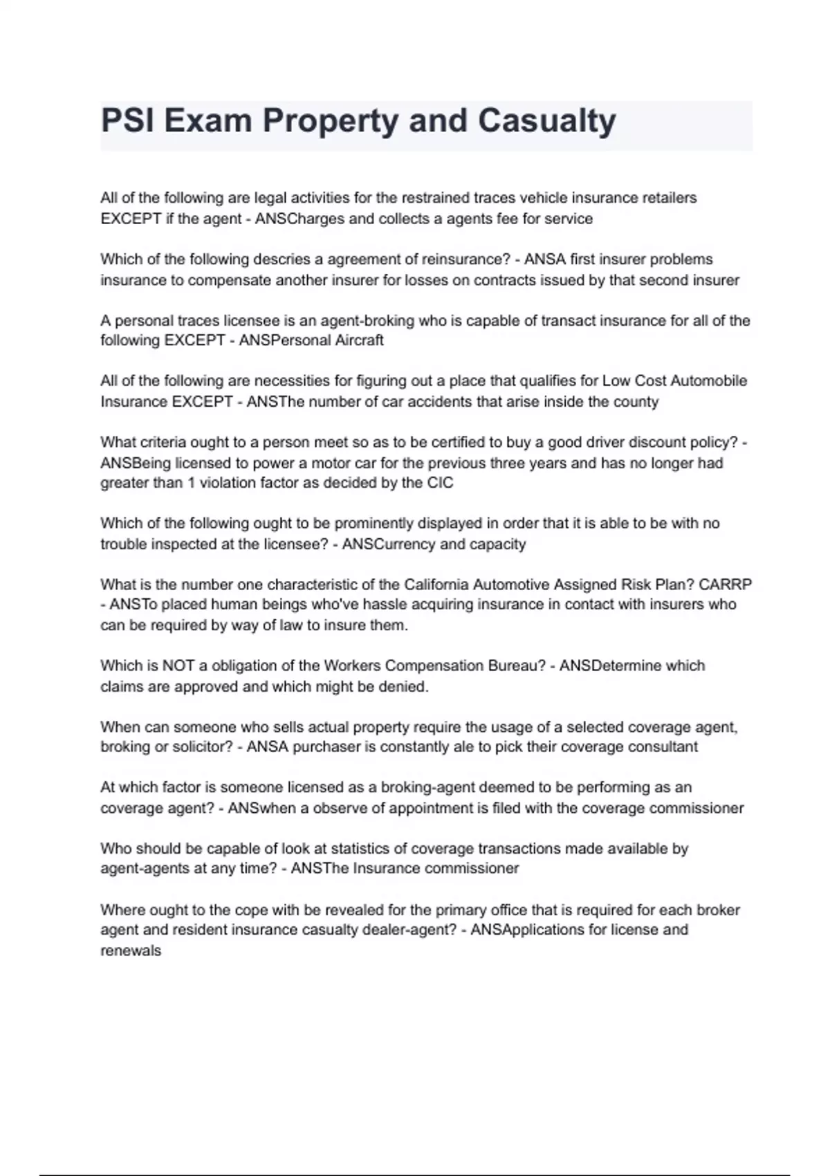 Which of the following descries a agreement of reinsurance? - ANSA first insurer problems