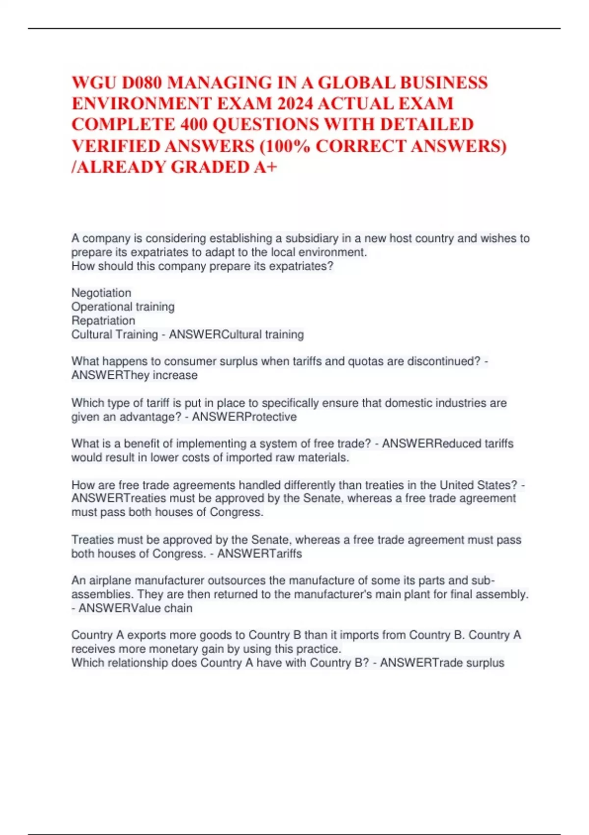 WGU D080 MANAGING IN A GLOBAL BUSINESS ENVIRONMENT EXAM 2024 ACTUAL EXAM COMPLETE 400 QUESTIONS WITH DETAILED VERIFIED ANSWERS (100% CORRECT ANSWERS) /ALREADY GRADED A+