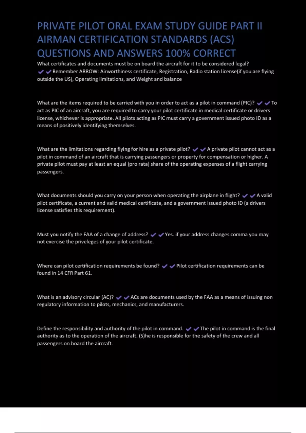 PRIVATE PILOT ORAL EXAM STUDY GUIDE PART II AIRMAN CERTIFICATION STANDARDS (ACS) QUESTIONS AND ANSWERS 100% CORRECT What certificates and documents must be on board the aircraft for it to be considered legal? Remember ARROW: Airworthiness certificate, Registration, Radio station license(if you are flying outside the US), Operating limitations, and Weight and balance What are the items required to be carried with you in order to act as a pilot in command (PIC)? To act as PIC of an aircraft, you are required to carry your pilot certificate in medical certificate or drivers license, whichever is appropriate. All pilots acting as PIC must carry a government issued photo ID as a means of positively identifying themselves.