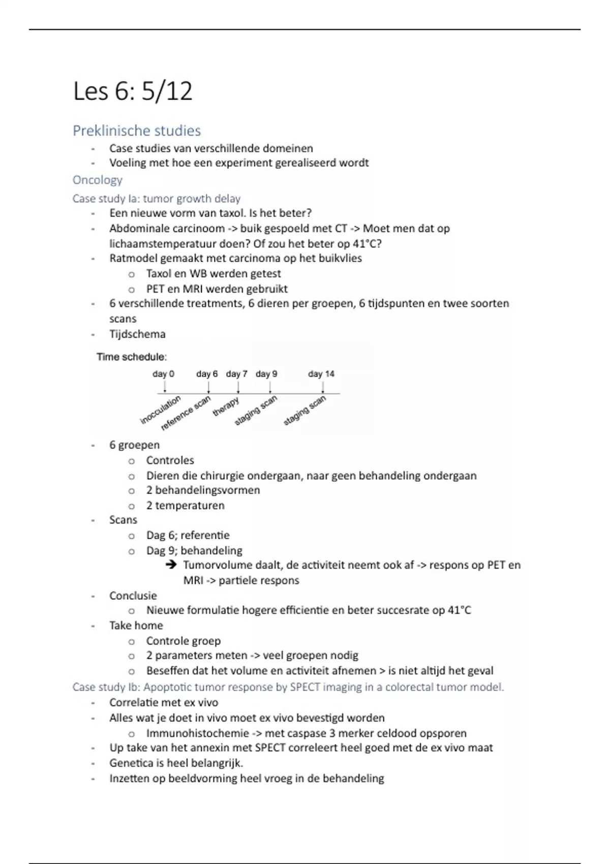 Dit document omvat de samenvatting van Les 6 van het vak 'Nucleaire biomedische beeldvorming, preklinische en klinische studies met focus op oncologie.'