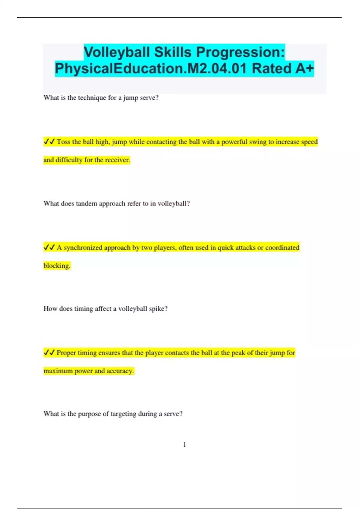 Volleyball Skills Progression: PhysicalEducation.M2.04.01 Rated A+ What is the technique for a jump serve? Toss the ball high, jump while contacting the ball with a powerful swing to increase speed and difficulty for the receiver. What does tandem approach refer to in volleyball? A synchronized approach by two players, often used in quick attacks or coordinated blocking. How does timing affect a volleyball spike? Proper timing ensures that the player contacts the ball at the peak of their jump for maximum power and accuracy. What is the purpose of targeting during a serve? 2 Aiming the serve at specific areas of the opponent's court to exploit weaknesses and increase the chance of scoring a point. How should a player perform a forearm pass? Use the forearms to create a flat platform, keeping the arms straight and angled to direct the ball accurately to a teammate. What is a quick set and how is it used? A fast, low set usually aimed at the middle hitter, used to surprise the opponents and speed up the offense. What does visual tracking involve in volleyball? Following the ball with your eyes to anticipate its trajectory and position yourself effectively for a successful play.