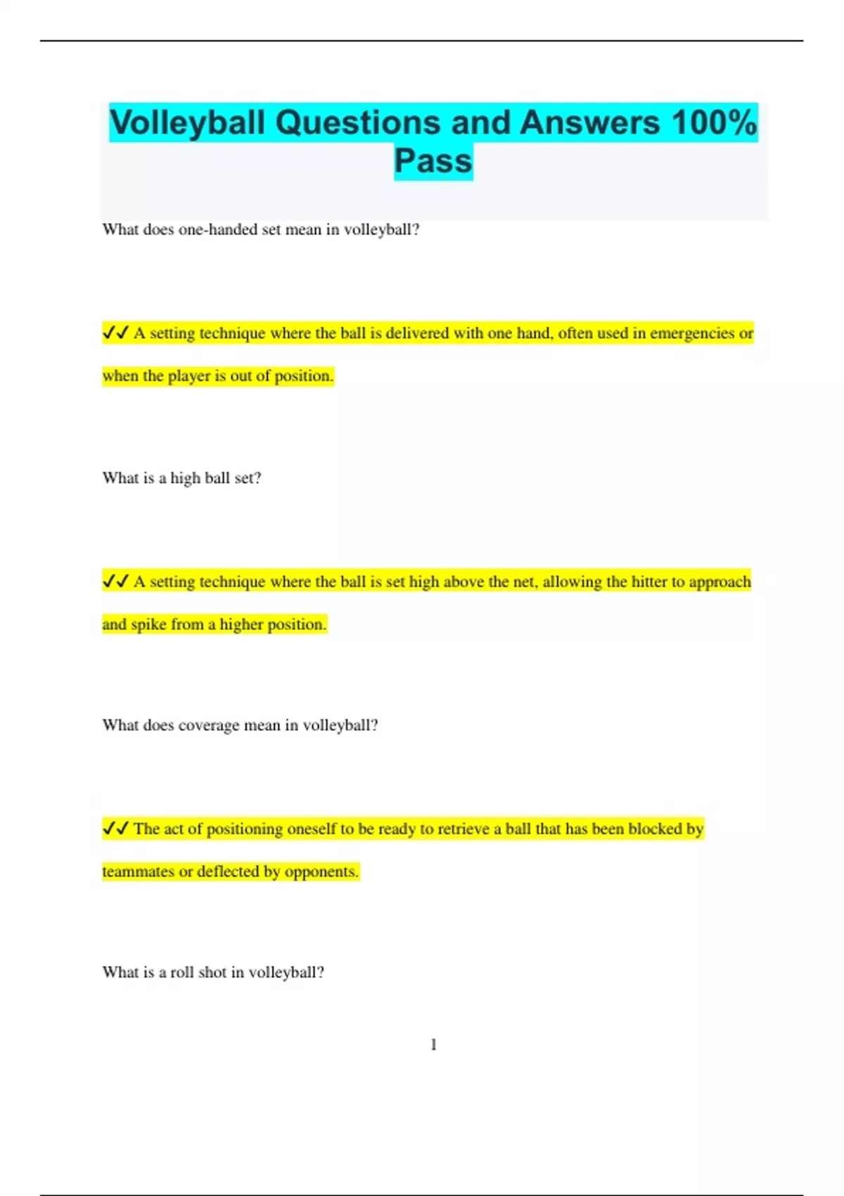Volleyball Questions and Answers 100% Pass What does one-handed set mean in volleyball? A setting technique where the ball is delivered with one hand, often used in emergencies or when the player is out of position. What is a high ball set? A setting technique where the ball is set high above the net, allowing the hitter to approach and spike from a higher position. What does coverage mean in volleyball? The act of positioning oneself to be ready to retrieve a ball that has been blocked by teammates or deflected by opponents. What is a roll shot in volleyball? 2 A soft, controlled hit where the ball rolls off the fingertips, intended to place it into an open area of the court. What does floor defense involve? Techniques used by players on the court to prevent the ball from hitting the ground, such as diving or rolling. What is a tight set? A set delivered close to the net, often requiring the hitter to adjust their approach to make a successful attack. How does a short serve function in volleyball? A serve that lands just over the net, designed to catch the opponent off guard by targeting a short area of the court.