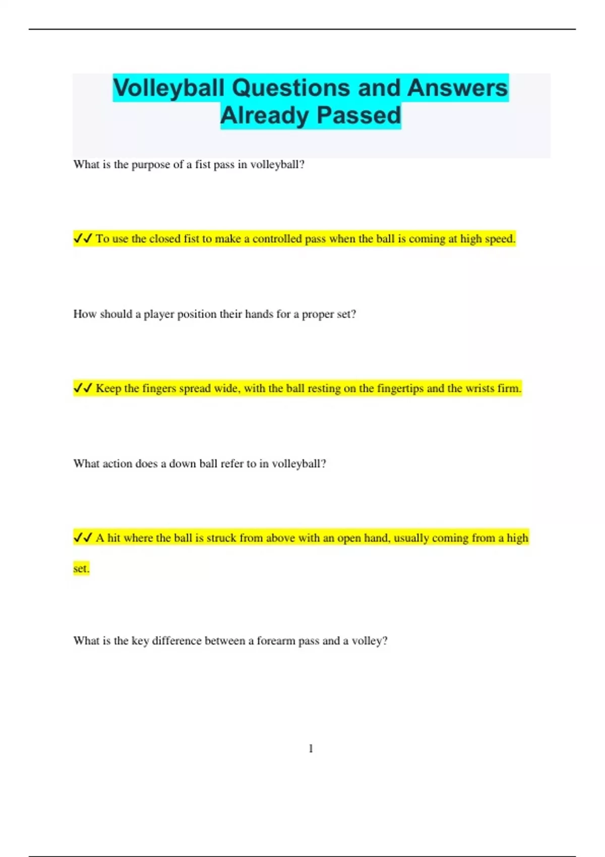 , ✔✔ A forearm pass uses the forearms to control the ball, while a volley uses the hands and