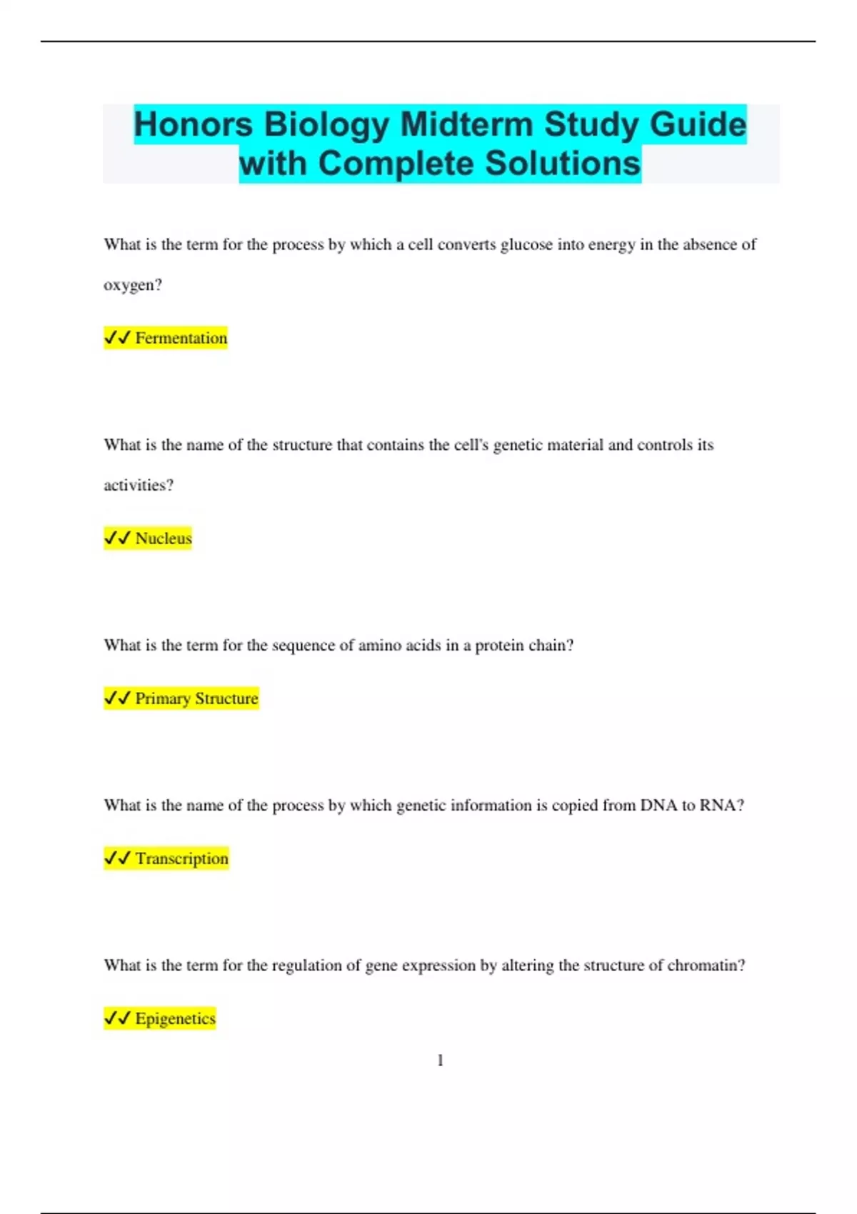 Honors Biology Midterm Study Guide with Complete Solutions What is the term for the process by which a cell converts glucose into energy in the absence of oxygen? Fermentation What is the name of the structure that contains the cell's genetic material and controls its activities? Nucleus What is the term for the sequence of amino acids in a protein chain? Primary Structure What is the name of the process by which genetic information is copied from DNA to RNA? Transcription What is the term for the regulation of gene expression by altering the structure of chromatin? Epigenetics 2 What is the name of the phase in mitosis where chromosomes line up at the cell's equatorial plane? Metaphase What is the term for the movement of molecules from an area of low concentration to an area of high concentration, requiring energy? Active Transport What is the name of the stage in meiosis where homologous chromosomes exchange genetic material? Crossing Over What is the term for the sum of all the chemical reactions occurring in an organism? Metabolism What is the name of the process by which plants use sunlight to convert carbon dioxide and water into glucose and oxygen?