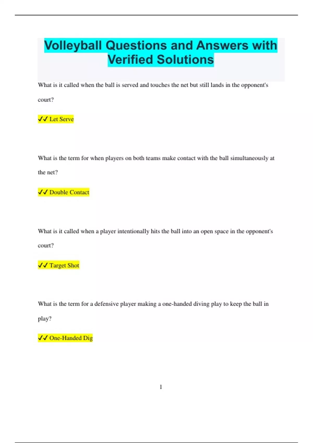 Volleyball Questions and Answers with Verified Solutions What is it called when the ball is served and touches the net but still lands in the opponent's court? Let Serve What is the term for when players on both teams make contact with the ball simultaneously at the net? Double Contact What is it called when a player intentionally hits the ball into an open space in the opponent's court? Target Shot What is the term for a defensive player making a one-handed diving play to keep the ball in play? One-Handed Dig 2 What is it called when a player steps over the service line while serving? Foot Fault What is the term for a spike that lands on the sideline and is considered in? Line Shot What is it called when the receiving team fails to return the serve, resulting in a point for the serving team? Service Ace What is the term for a quick, deceptive play where the setter pushes the ball over the net on the second touch? Second Ball Attack What do you call a serve that spins in multiple directions, making it hard to predict? Jump Float