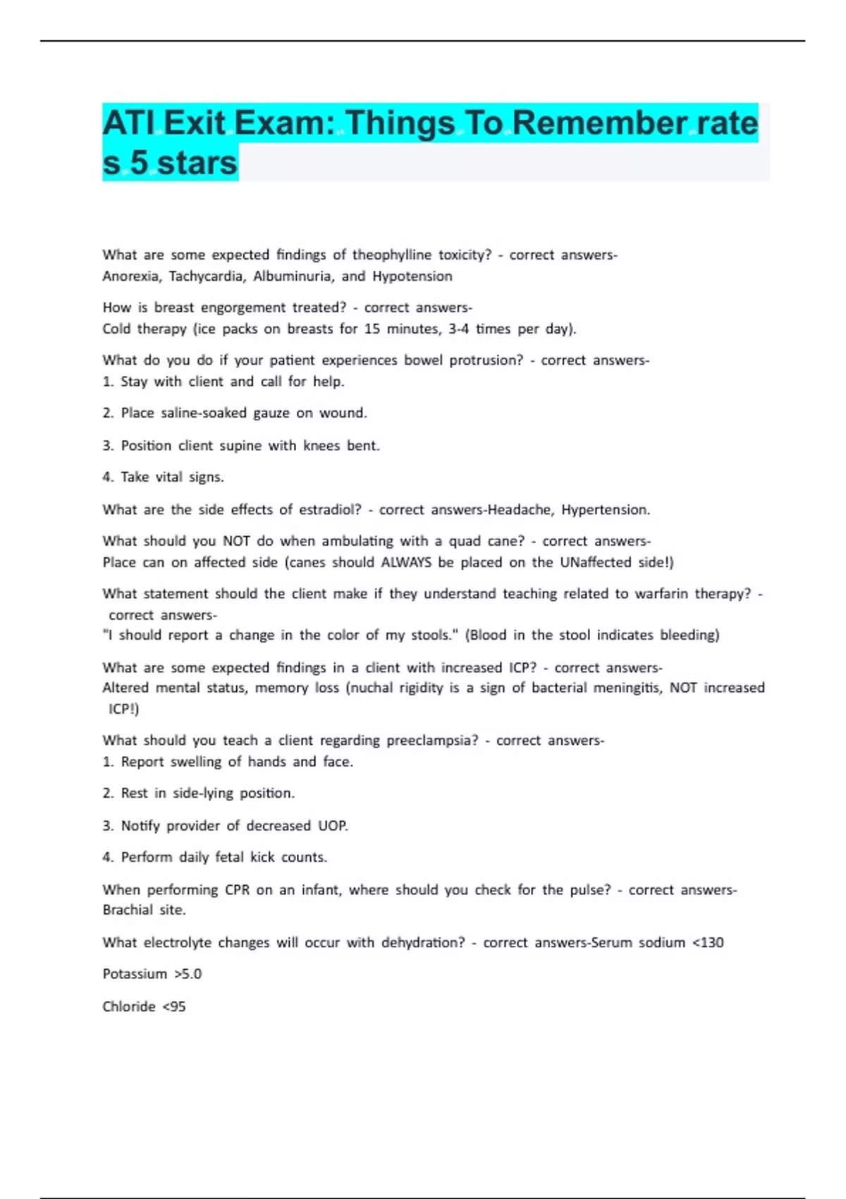 ATI Exit Exam: Things To Remember rates 5 starsATI Exit Exam: Things To Remember rates 5 starsATI Exit Exam: Things To Remember rates 5 stars What are some expected findings of theophylline toxicity? - correct answers-Anorexia, Tachycardia, Albuminuria, and Hypotension How is breast engorgement treated? - correct answers-Cold therapy (ice packs on breasts for 15 minutes, 3-4 times per day). What do you do if your patient experiences bowel protrusion? - correct answers-1. Stay with client and call for help. 2. Place saline-soaked gauze on wound. 3. Position client supine with knees bent. 4. Take vital signs. What are the side effects of estradiol? - correct answers-Headache, Hypertension. What should you NOT do when ambulating with a quad cane? - correct answers-Place can on affected side (canes should ALWAYS be placed on the UNaffected side!) What statement should the client make if they understand teaching related to warfarin therapy? - correct answers-"I should report a change in the color of my stools." (Blood in the stool indicates bleeding) What are some expected findings in a client with increased ICP? - correct answers-Altered mental status, memory loss (nuchal rigidity is a sign of bacterial meningitis, NOT increased ICP!) What should you teach a client regarding preeclampsia? - correct answers-1. Report swelling of hands and face. 2. Rest in side-lying position. 3. Notify provider of decreased UOP. 4. Perform daily fetal kick counts. When performing CPR on an infant, where should you check for the pulse? - correct answers-Brachial site. What electrolyte changes will occur with dehydration? - correct answers-Serum sodium <130 Potassium >5.0 Chloride <95 Glucose <70 BUN >25 Creatinine >1.5 Urine Specific Gravity >1.030 How should a client climb the stairs using crutches? - correct answers-1. Tripod position. 2. Place body weight on crutches. 3. Advance unaffected leg. 4. Advance crutches and affected leg. What should you AVOID regarding nutrition following a tonsillectomy? - correct answers-Do not give ice cream! It will make the client cough. What are the major manifestations of a hemolytic blood transfusion reaction? - correct answers-Tachycardia and LOW BACK PAIN For pregnant women, why would a bead be placed on the P6 meridian of the wrist? - correct answers-This is an alternative medical technique that aids in alleviation of nausea/vomiting. What are some normal findings during the newborn assessment that are usually thought to be abnormal? - correct answers-Apnea for up to 10 seconds Acrocyanosis (hands and feet are blue) What should you teach a client with home oxygen therapy? - correct answers-Always wear COTTON clothing to reduce static electricity. Check oxygen tank/equipment function daily. Why should drinking grapefruit juice be avoided when taking verapamil, a calcium channel blocker? - correct answe