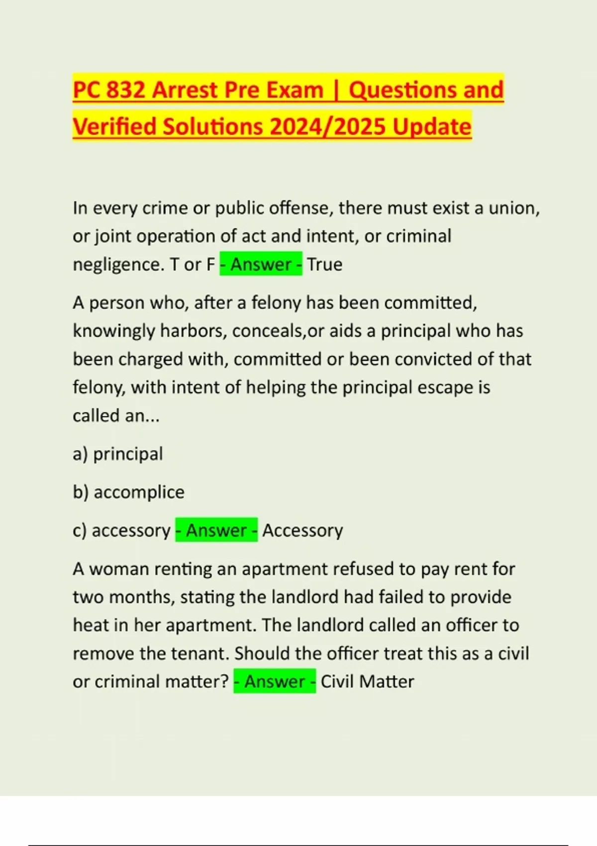 PC 832 Arrest Pre Exam | Questions and Verified Solutions 2024/2025 Update In every crime or public offense, there must exist a union, or joint operation of act and intent, or criminal negligence. T or F - Answer - True A person who, after a felony has been committed, knowingly harbors, conceals,or aids a principal who has been charged with, committed or been convicted of that felony, with intent of helping the principal escape is called an... a) principal b) accomplice c) accessory - Answer - Accessory A woman renting an apartment refused to pay rent for two months, stating the landlord had failed to provide heat in her apartment. The landlord called an officer to remove the tenant. Should the officer treat this as a civil or criminal matter? - Answer - Civil MatterThe right to ABSOLUTE privacy is one of the fundamental rights guaranteed by the Bill of Rights - Answer - False Search and arrest warrants must show probable cause and must also particularly state items or persons to be searched or seized. Peace Officers must always adhere to the constraints of the warrant. T or F - Answer - True Mr. Guzman was living in a drug treatment center. In his room he had several suitcases in which he kept his personal property. Police ca