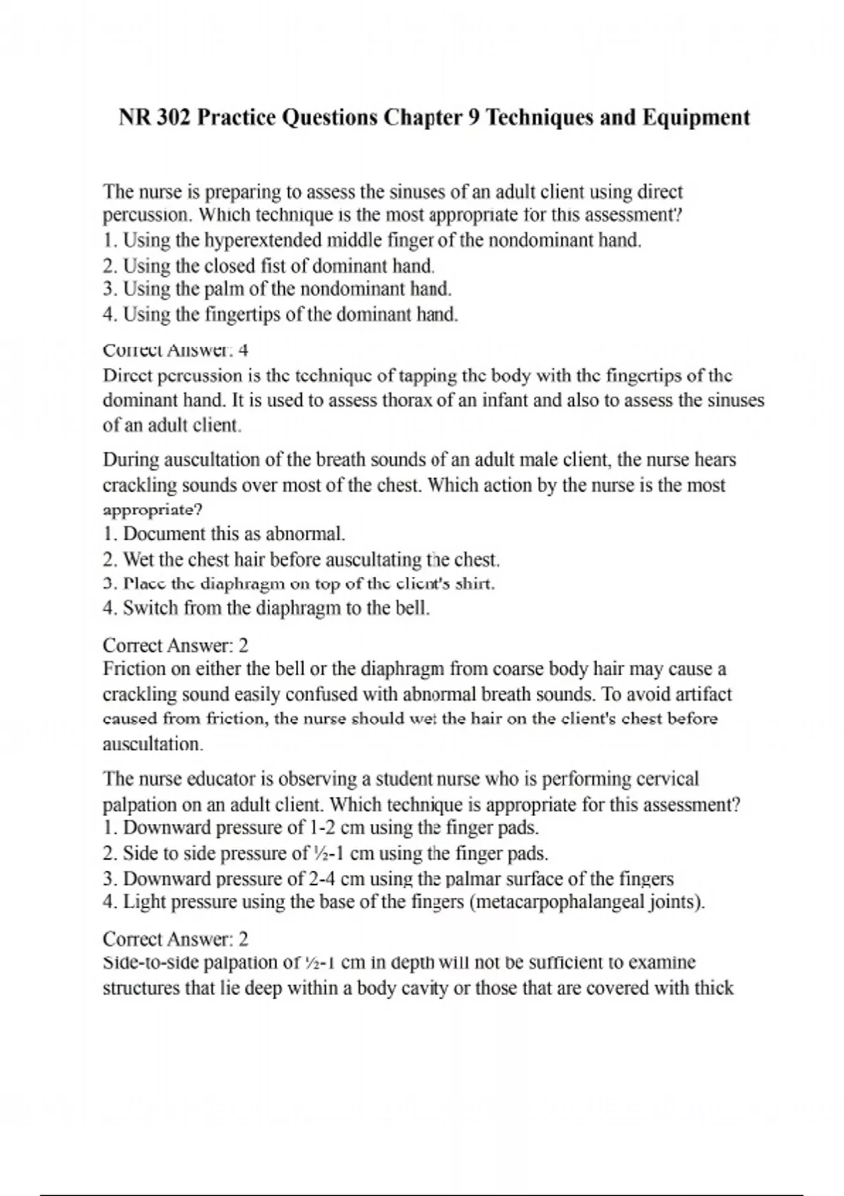The nurse is preparing to assess the sinuses of an adult client using direct percussion. Which technique is the most appropriate for this assessment? 1. Using the hyperextended middle finger of the nondominant hand. 2. Using the closed fist of dominant hand. 3. Using the palm of the nondominant hand. 4. Using the fingertips of the dominant hand. Correct Answer: 4 Direct percussion is the technique of tapping the body with the fingertips of the dominant hand. It is used to assess thorax of an infant and also to assess the sinuses of an adult client. During auscultation of the breath sounds of an adult male client, the nurse hears crackling sounds over most of the chest. Which action by the nurse is the most appropriate? 1. Document this as abnormal. 2. Wet the chest hair before auscultating the chest. 3. Place the diaphragm on top of the client's shirt. 4. Switch from the diaphragm to the bell. Correct Answer: 2 Friction on either the bell or the diaphragm from coarse body hair may cause a crackling sound easily confused with abnormal breath sounds. To avoid artifact caused from friction, the nurse should wet the hair on the client's chest before auscultation. The nurse educator is observing a student nurse who is performing cervical palpation on an adult client. Which technique is appropriate for this assessment? 1. Downward pressure of 1-2 cm using the finger pads. 2. Side to side pressure of ½-1 cm using the finger pads. 3. Downward pressure of 2-4 cm using the palmar surface of the fingers 4. Light pressure using the base of the fingers (metacarpophalangeal joints). Correct Answer: 2 Side-to-side palpation of ½-1 cm in depth will not be sufficient to examine structures that lie deep within a body cavity or those that are covered with thick muscle. This may be sufficient to determine the size and consistency of a finding in the soft tissue (such as a cervical lymph node). The nurse is preparing to assess a client's abdomen. Place the sequence for an abdominal assessment is the correct order. Standard Text: Click on the down arrow for each response in the right column and select the correct choice from the list. Response 1. Percussion. Response 2. Palpation. Response 3. Auscultation. Response 4. Inspection. Correct Answer: 4, 3, 1, 2 The nurse is inspecting a client's chest and upper extremities. Which would be the appropriate method for the nurse to assess these body areas? 1. Examine the right arm, the chest, and then the left arm. 2. Examine the left arm, the chest, and then the right arm. 3. Examine the left arm, the right arm, and then the chest. 4. Examine the chest, and then examine the arms at the conclusion of the exam, as the client is re-dressing. Correct Answer: 3 Inspection begins with a survey of the client's appearance and a comparison of the right and left sides of the body, which should be nearly symmetrical.