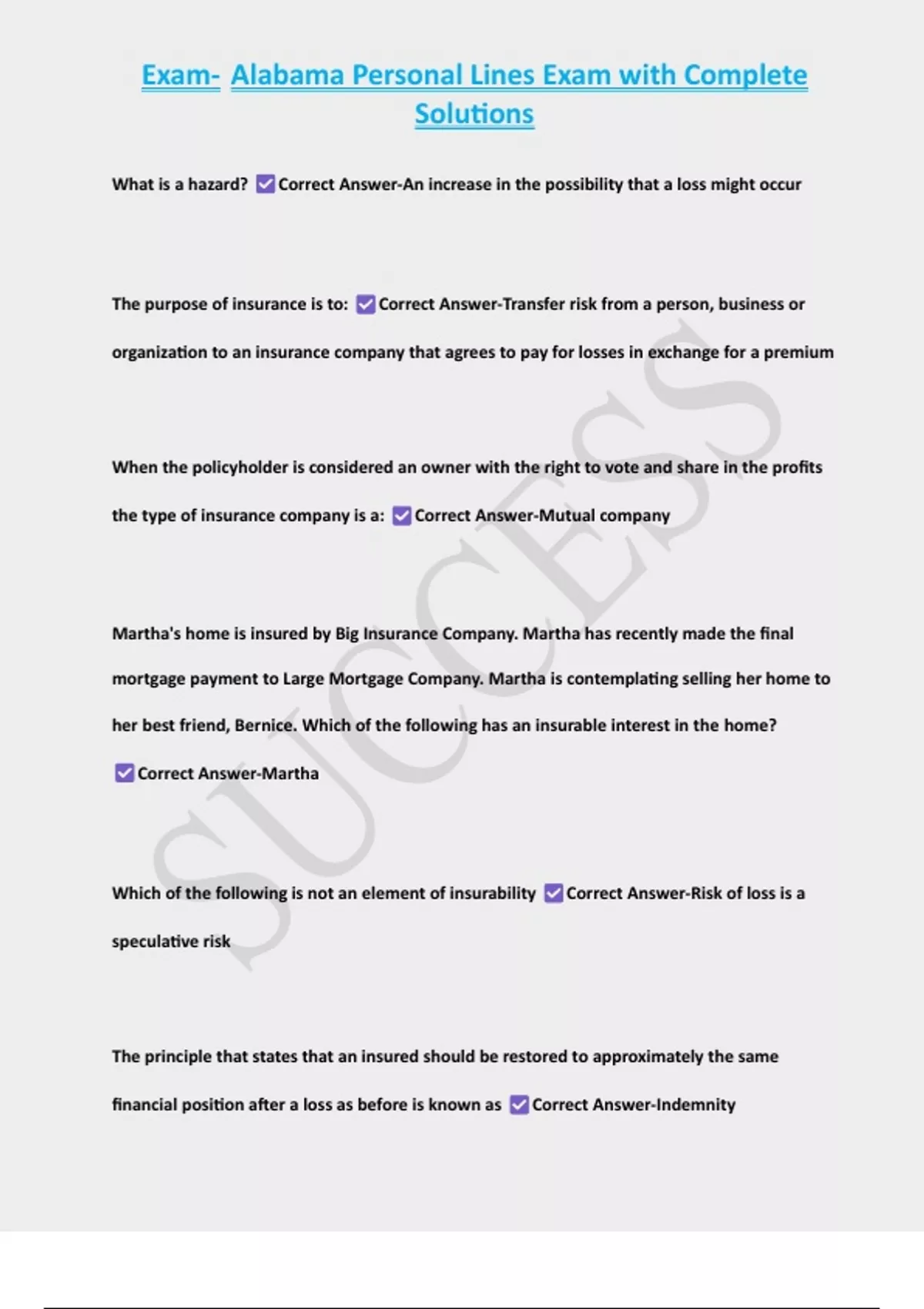 The purpose of insurance is to: Correct Answer-Transfer risk from a person, business or