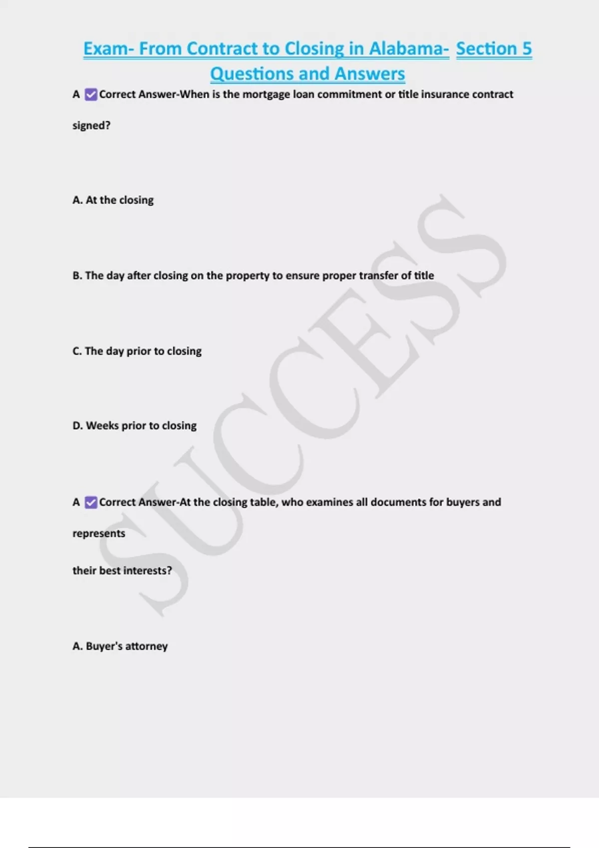 Exam- From Contract to Closing in Alabama- Section 5 Questions and Answers
