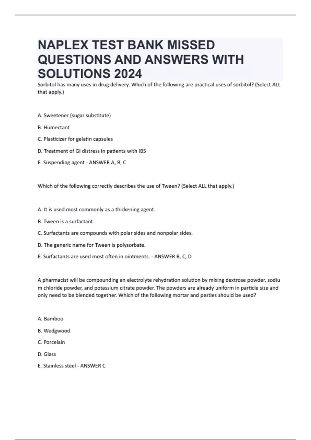 SorbitolPhasPmanyPusesPinPdrugPdelivery.PWhichPofPthePfollowingParePpracticalPusesPofPsorbitol?P(SelectPALLP