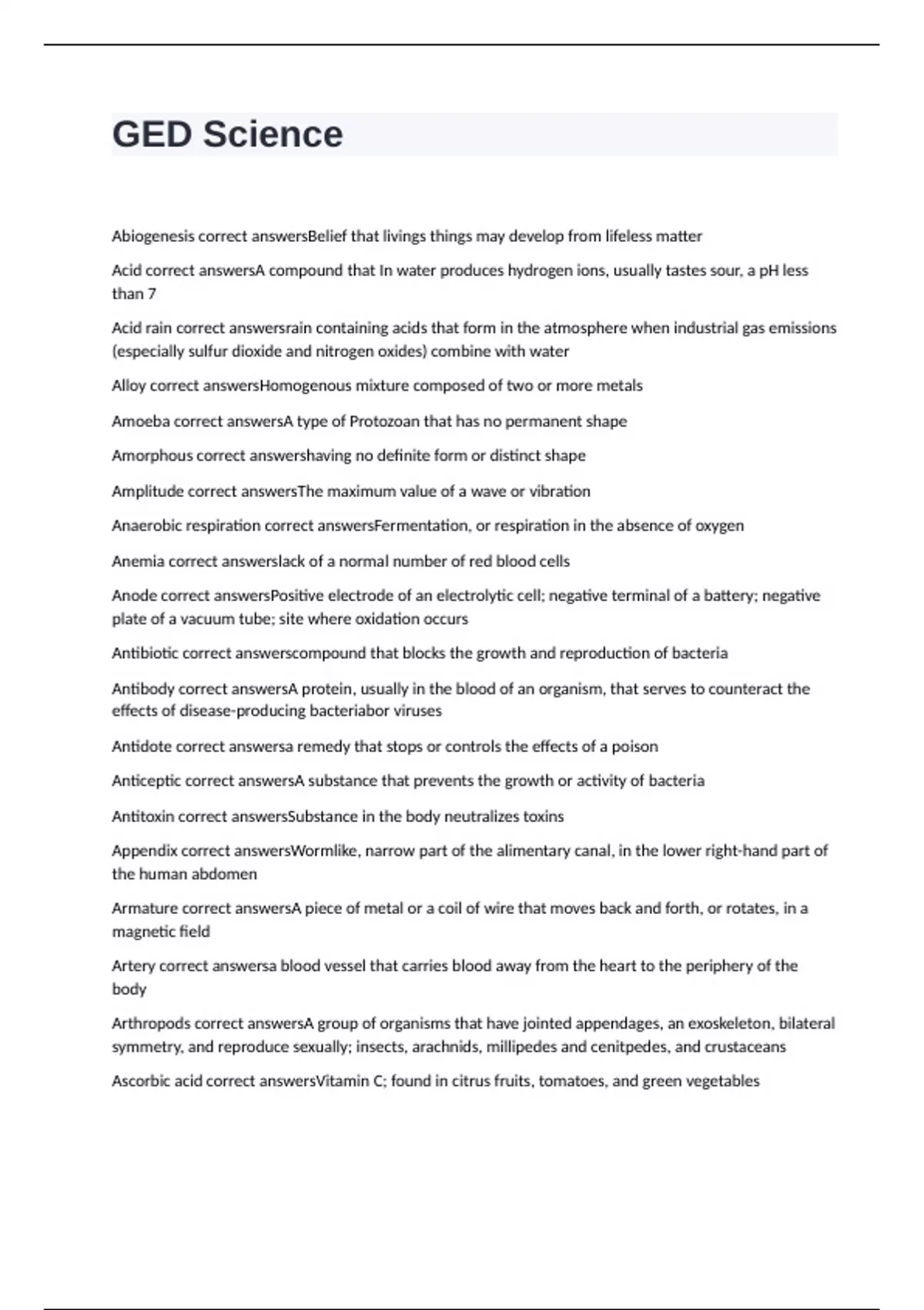 Abiogenesis correct answersBelief that livings things may develop from lifeless matter Acid correct answersA compound that In water produces hydrogen ions, usually tastes sour, a pH less than 7 Acid rain correct answersrain containing acids that form in the atmosphere when industrial gas emissions (especially sulfur dioxide and nitrogen oxides) combine with water Alloy correct answersHomogenous mixture composed of two or more metals Amoeba correct answersA type of Protozoan that has no permanent shape Amorphous correct answershaving no definite form or distinct shape Amplitude correct answersThe maximum value of a wave or vibration Anaerobic respiration correct answersFermentation, or respiration in the absence of oxygen Anemia correct answerslack of a normal number of red blood cells Anode correct answersPositive electrode of an electrolytic cell; negative terminal of a battery; negative plate of a vacuum tube; site where oxidation occurs Antibiotic correct answerscompound that blocks the growth and reproduction of bacteria Antibody correct answersA protein, usually in the blood of an organism, that serves to counteract the effects of disease-producing bacteriabor viruses Antidote correct answersa remedy that stops or controls the effects of a poison Anticeptic correct answersA substance that prevents the growth or activity of bacteria Antitoxin correct answersSubstance in the body neutralizes toxins Appendix correct answersWormlike, narrow part of the alimentary canal, in the lower right-hand part of the human abdomen Armature correct answersA piece of metal or a coil of wire that moves back and forth, or rotates, in a magnetic field Artery correct answersa blood vessel that carries blood away from the heart to the periphery of the body Arthropods correct answersA group of organisms that have jointed appendages, an exoskeleton, bilateral symmetry, and reproduce sexually; insects, arachnids, millipedes and cenitpedes, and crustaceans Ascorbic acid correct answersVitamin C; found in citrus fruits, tomatoes, and green vegetables