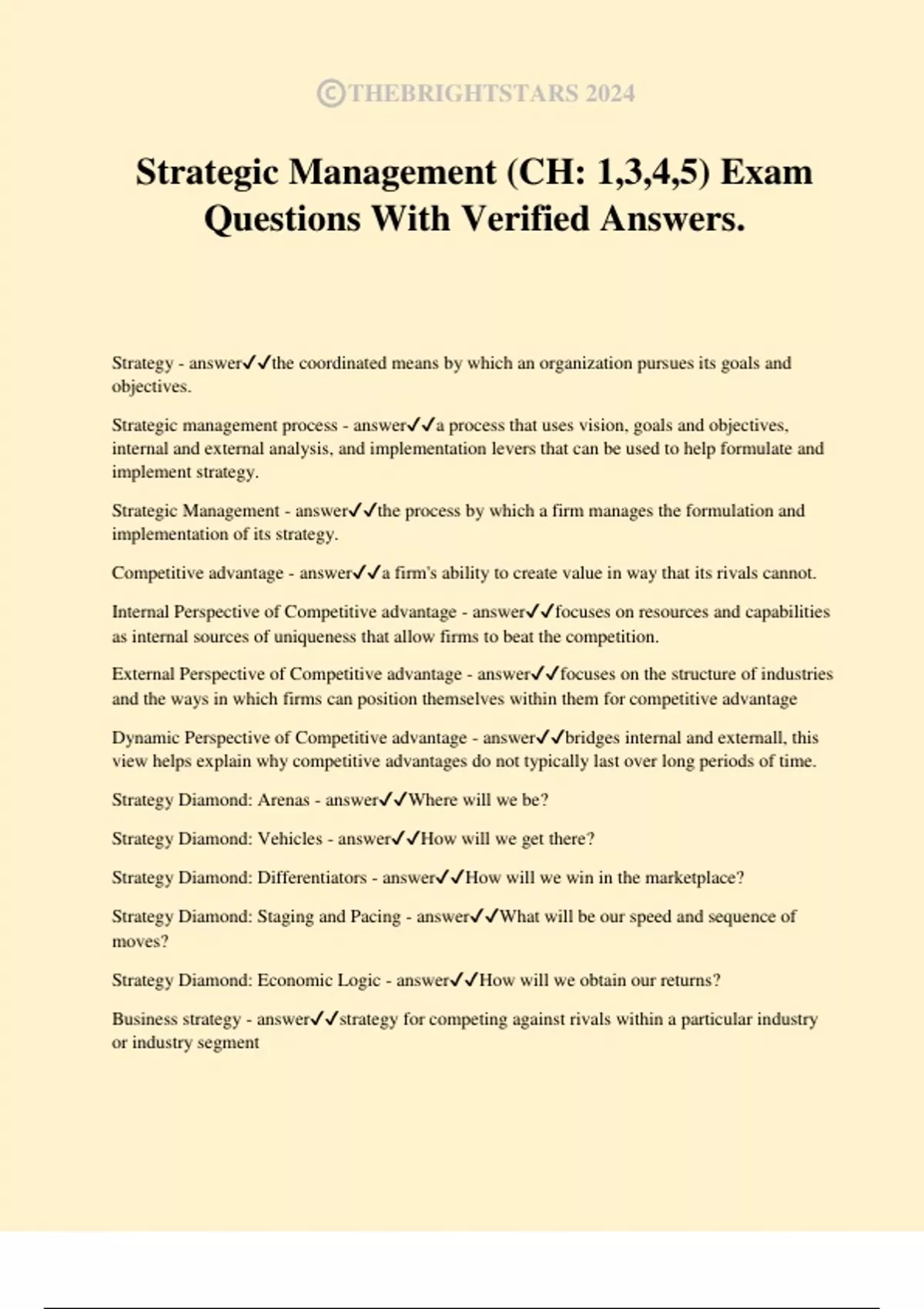 Strategic Management - answer✔✔the process by which a firm manages the formulation and