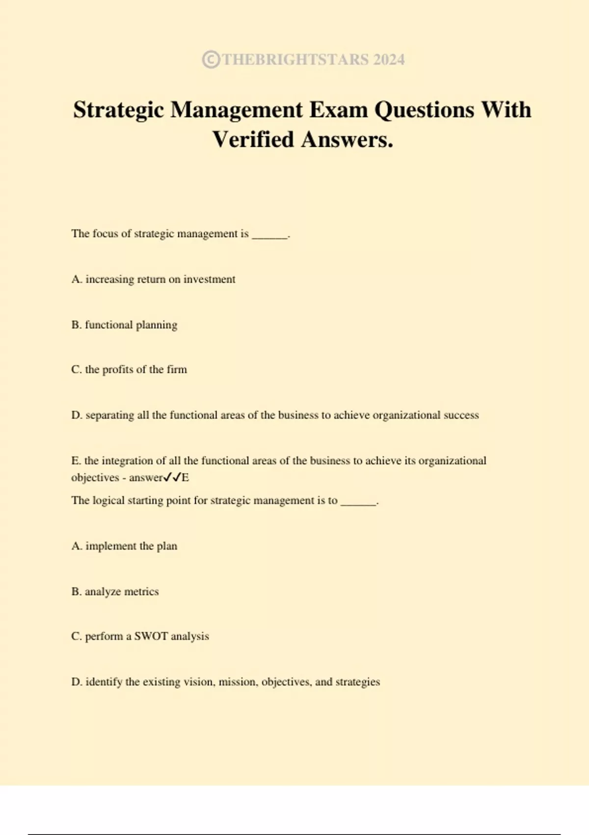 Strategic Management Exam Questions With Verified Answers. The focus of strategic management is ______. A. increasing return on investment B. functional planning C. the profits of the firm D. separating all the functional areas of the business to achieve organizational success E. the integration of all the functional areas of the business to achieve its organizational objectives - answerE The logical starting point for strategic management is to ______. A. implement the plan B. analyze metrics C. perform a SWOT analysis D. identify the existing vision, mission, objectives, and strategies ©THEBRIGHTSTARS 2024 E. hold off-premises retreats - answerD The strategic management process begins with______. A. strategy implementation B. strategic opportunity identification C. strategy formulation D. strategy evaluation E. strategic planning - answerC In which stage of the strategic management process is an organization likely to develop a mission statement? A. Strategic opportunity identification B. Strategy evaluation C. Strategy implementation D. Strategy formulation E. Strategic planning - answerD Analytical thinking and intuitive thinking ______. A. are seldom used together ©THEBRIGHTSTARS 2024 B. are typically at odds with each other C. complement each other D. guarantee strategic success E. are not used in strategic planning - answerC The strategic-management process can be described as an objective, logical, systematic approach for making major decisions in an organization. However, it is generally recognized that ______ is essential to making good strategic decisions. A. ignoring intuition B. intuition C. ignorance D. ignoring change E. undisciplined intuition - answerB Apple's financially lean position with regard to manufacturing facilities provides the firm with a _______ over Sony, which invest
