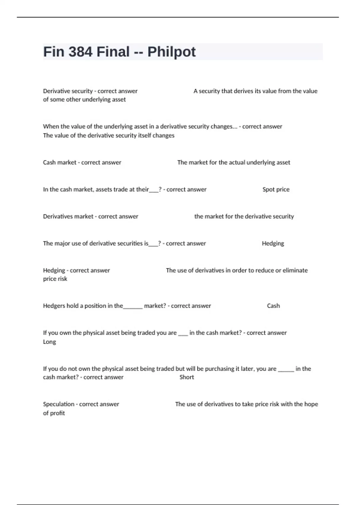 Fin 384 Final -- Philpot Certification Review Exam Questions With Detailed Answers.