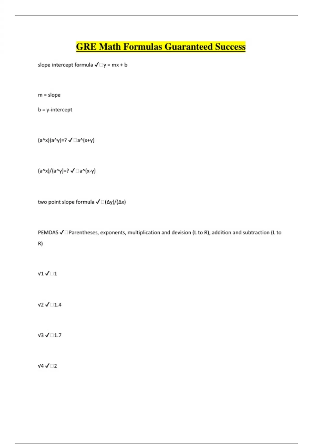 GRE Math Formulas Guaranteed Success slope intercept formula ️y = mx + b m = slope b = y-intercept (a^x)(a^y)=? ️a^(x+y) (a^x)/(a^y)=? ️a^(x-y) two point slope formula ️(Δy)/(Δx) PEMDAS ️Parentheses, exponents, multiplication and devision (L to R), addition and subtraction (L to R) √1 ️1 √2 ️1.4 √3 ️1.7 √4 ️2 negative × negative = ? ️positive positive × negative = ? ️negative Only even prime number ️2 x⁻ⁿ = ? ️1/xⁿ A number is divisible by 3 if... ️The sum of its digits is divisible by 3 A number is divisible by 5 if... ️It ends in 0 or 5 A number is divisible by 2 if... ️Its ones place is divisible by 2 Area of a Δ ️½bh Pythagorean Theorem ️(Only applies to right triangles) c² = a² + b² where a and b are the sides and c is the hypotenuse Area of a O ️πr² Circumference of a O ️2πr or πd Distance between two points ️d = √(x₁-x₂)² + (y₁-y₂)² Volume of rectangular solid ️lwh Volume of circular cylinder ️πr²h Calculating an Average ️(total value, or sum)/(# of numbers being averaged) Calculating Percent Change ️(difference/original) × 100 Quadratic Equations ️x²-y² = (x+y)(x-y) (x+y)² = x² + 2xy + y² (x-y)² = x² - 2xy - y² Solving an Inequality ️When multiplying or dividing both sides by a negative number, always change the inequality sign (i.e. if it was then change it to , if it was then change it to ) Calculating Probability ️(# favorable outcomes)/(total # possible outcomes)