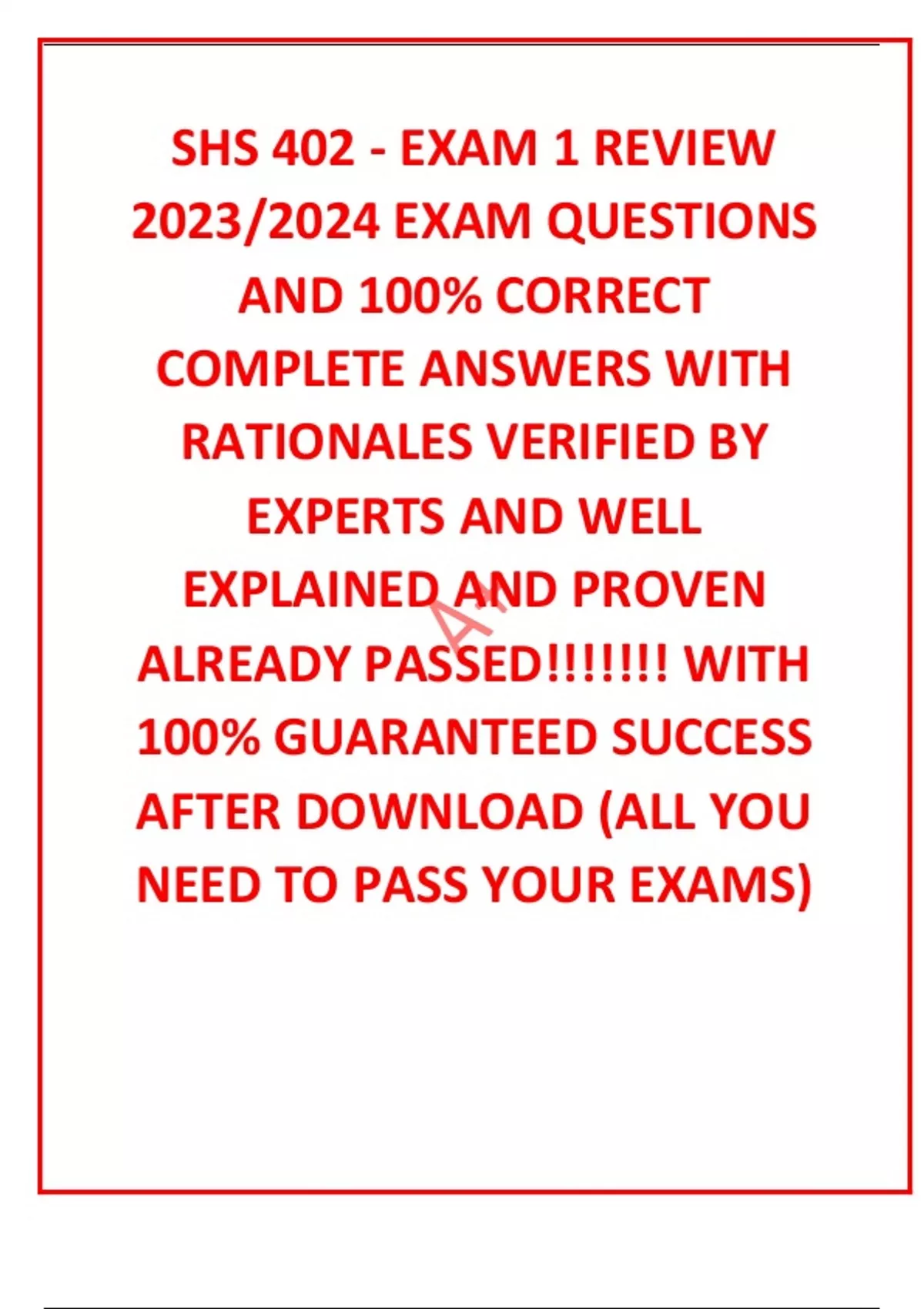 SHS 402 - EXAM 1 REVIEW 2023/2024 EXAM QUESTIONS AND 100% CORRECT COMPLETE ANSWERS WITH RATIONALES VERIFIED BY EXPERTS AND WELL EXPLAINED AND PROVEN ALREADY PASSED!!!!!!! WITH 100% GUARANTEED SUCCESS AFTER DOWNLOAD (ALL YOU NEED TO PASS YOUR EXAMS) dynamic process clinician continuously assesses the patient's progress toward goals and modifies as necessary ultimate goal of intervention teach strategies for facilitating the communication process rather than teaching isolated skills intervention program design designed with careful consideration to client's verbal and nonverbal cognitive abilities. Knowledge of client's level of cognitive function is critical in making decisions about eligibility for treatment and select appropriate therapy objectives teaching skills required to achieve specific outcomes in given situations teaching strategy enable the individual to know when and how to use their skills in new and varied learning contexts when is intervention terminated? once client achieved goals or no longer demonstrates progress programming selection, sequencing and generalization of therapy targets behavior modification systematic use of specific stimulus-response-consequence procedures key teaching strategies use of basic training techniques to facilitate learning session design organization and implementation of therapy sessions, including interpersonal dynamics data collection systematic measurement of client performance and treatment efficacy selection of therapy targets establish goals. Pre-treatment baselines. Developmental/Normative Strategy OR Client-Specific Strategy.