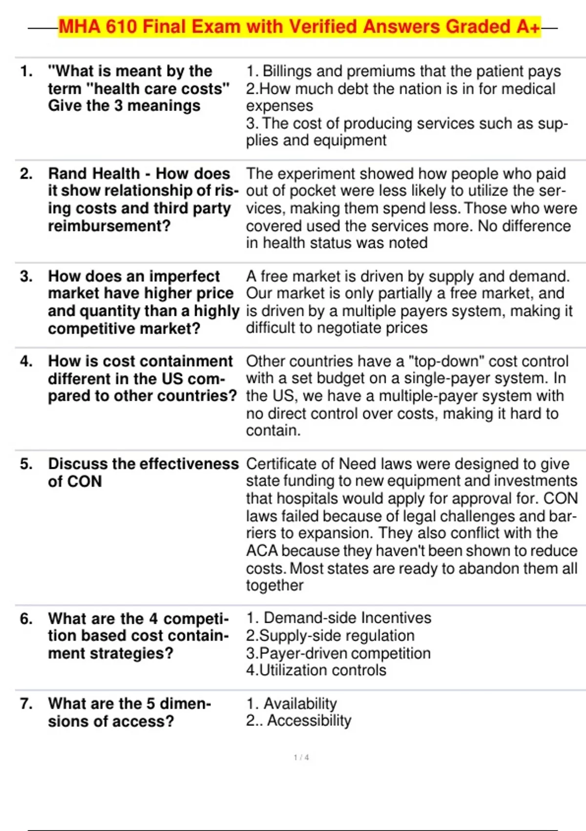 MHA 610 Final Exam with Verified Answers Graded A+ 1. "What is meant by the term "health care costs" Give the 3 meanings 2. Rand Health - How does it show relationship of ris- ing costs and third party reimbursement? 3. How does an imperfect market have higher price and quantity than a highly competitive market? 4. How is cost containment different in the US com- pared to other countries? 5. Discuss the effectiveness of CON 6. What are the 4 competi- tion based cost contain- ment strategies? 7. What are the 5 dimen- sions of access? 1. Billings and premiums that the patient pays 2.How much debt the nation is in for medical expenses 3. The cost of producing services such as sup- plies and equipment The experiment showed how people who paid out of pocket were less likely to utilize the ser- vices, making them spend less. Those who were covered used the services more. No difference in healt