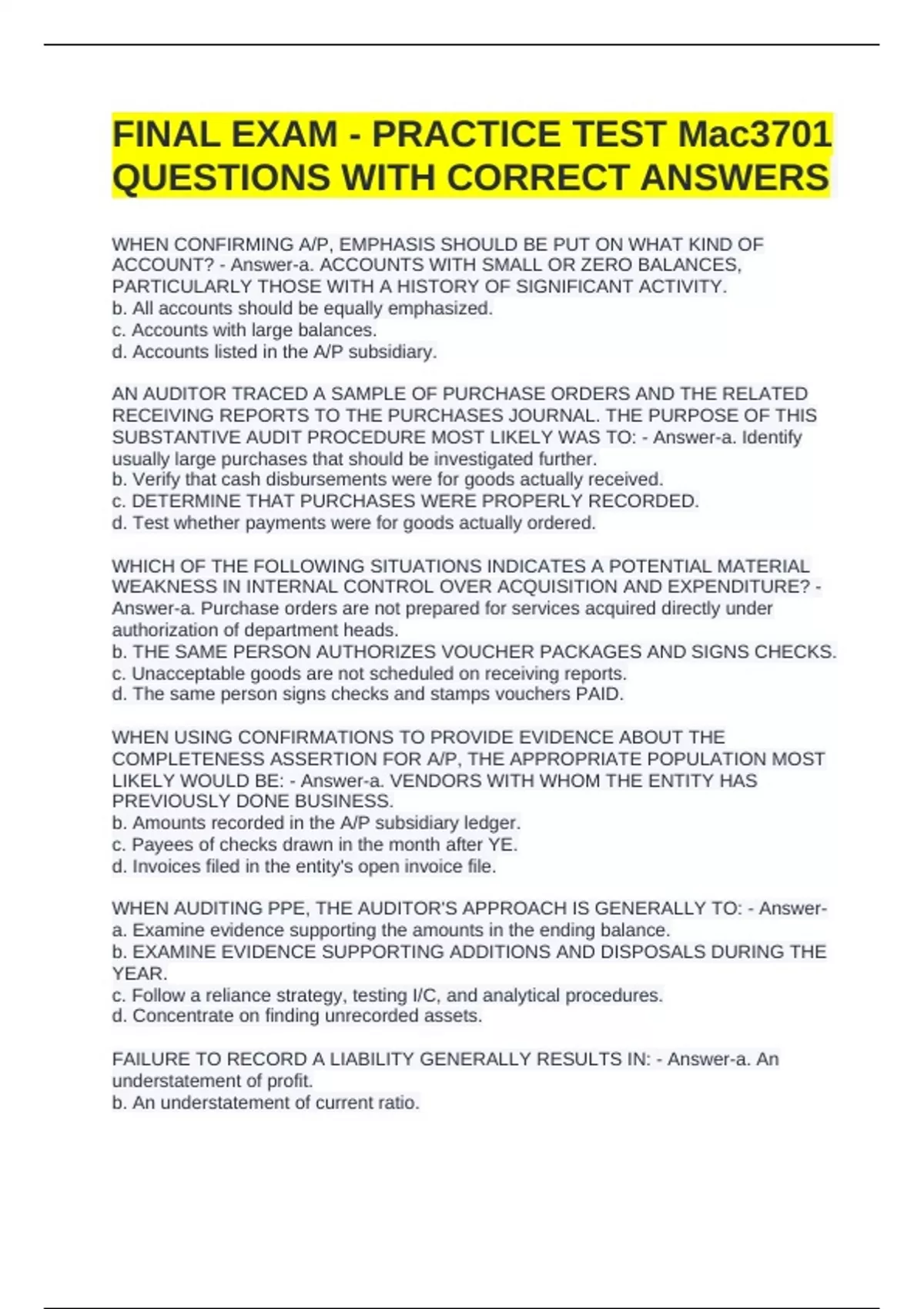 SUBSTANTIVE AUDIT PROCEDURE MOST LIKELY WAS TO: - Answer-a. Identify