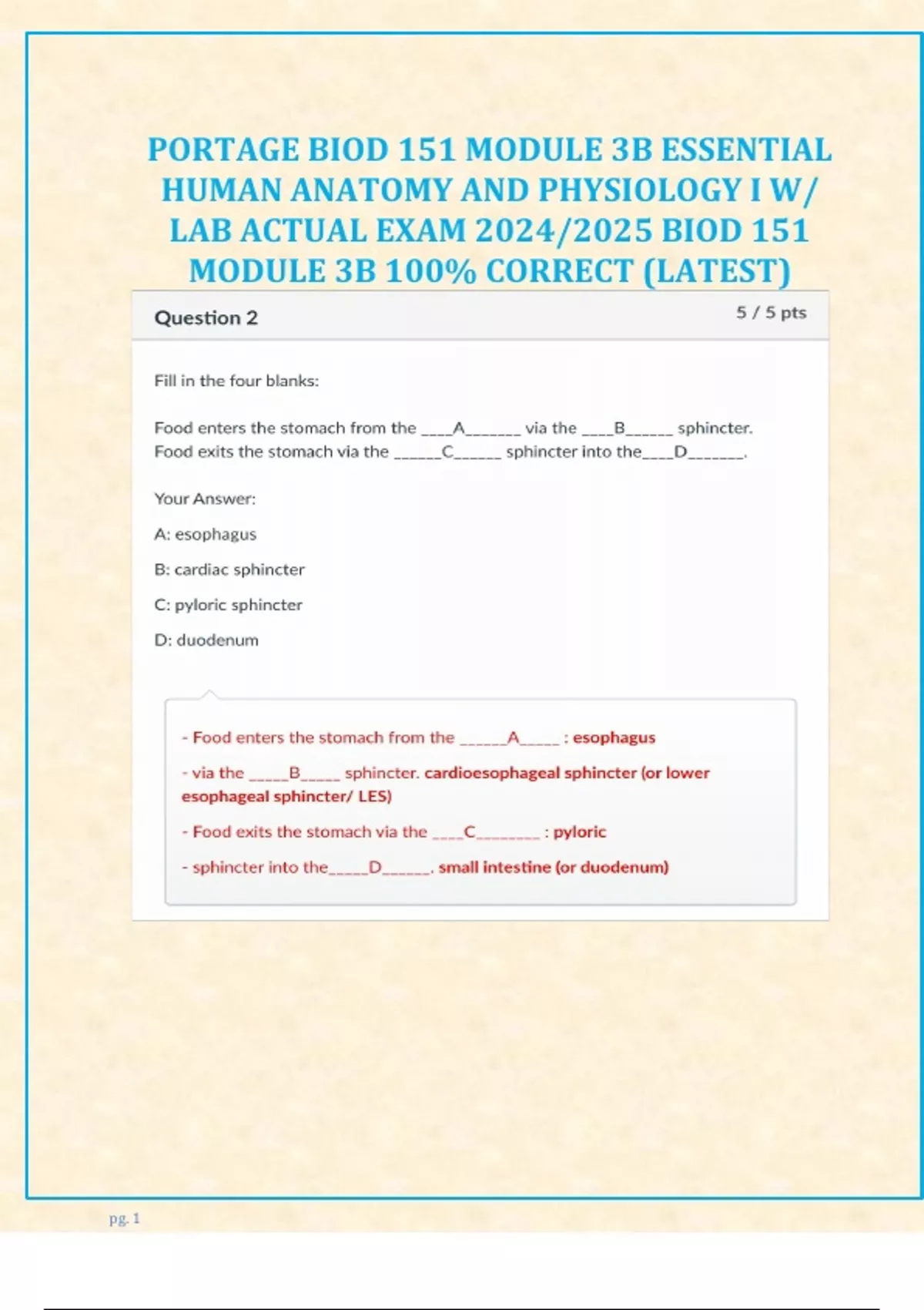 PORTAGE BIOD 151 MODULE 3B ESSENTIAL HUMAN ANATOMY AND PHYSIOLOGY I W/ LAB ACTUAL EXAM 2024/2025 BIOD 151 MODULE 3B 100% CORRECT (LATEST)