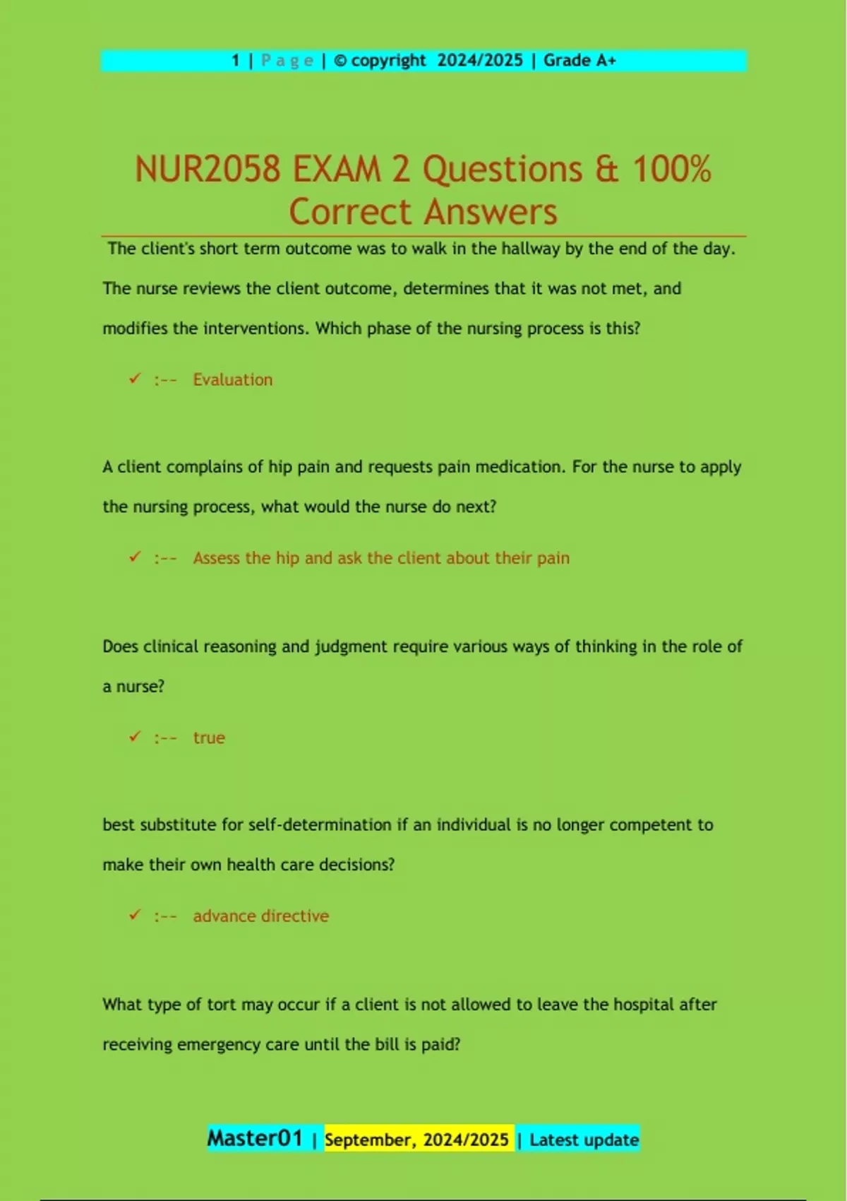 The client's short term outcome was to walk in the hallway by the end of the day. The nurse reviews the client outcome, determines that it was not met, and modifies the interventions. Which phase of the nursing process is this? :~~ Evaluation A client complains of hip pain and requests pain medication. For the nurse to apply the nursing process, what would the nurse do next? :~~ Assess the hip and ask the client about their pain Does clinical reasoning and judgment require various ways of thinking in the role of a nurse? :~~ true best substitute for self-determination if an individual is no longer competent to make their own health care decisions? :~~ advance directive What type of tort may occur if a client is not allowed to leave the hospital after receiving emergency care until the bill is paid? 2 | P a g e | © copyright 2024/2025 | Grade A+ Master01 | September, 2024/2025 | Latest update :~~ False imprisonment the steps to the nursing process :~~ Assessment, Diagnosis, Planning, Implementing, Evaluation How can most living organisms be classified in general systems theory? :~~ Open Systems When applying the nursing process, which of the following should always be addressed first? :~~ assessment A client is held down by the nurse and forced to have a nasogastric tube placed. Which of the following could this represent? :~~ Battery The nurse is assigned to see a home-bound client on a daily basis to prepare the client's medications. The nurse fails to visit the client and does not request that another nurse visit the client. The client is later admitted to the hospital after taking the wrong dosage of medication. Which ethical concept does this situation reflect? 3 | P a g e | © copyright 2024/2025 | Grade A+ Master01 | September, 2024/2025 | Latest update :~~ abandonment nursing code of ethics except :~~ Provides specific answer to many ethical dilemmas phases of the nursing process determines client problems, risks, and strengths? :~~ Diagnosis another term that can be used for professional negligence :~~ Malpractice invasion of privacy :~~ Discussing Mrs. Green's surgery in the hospital cafeteria The client must have a treatment requiring an informed consent. Whose role is it to review the proposed treatment and its associated risks with the client? :~~ Physici